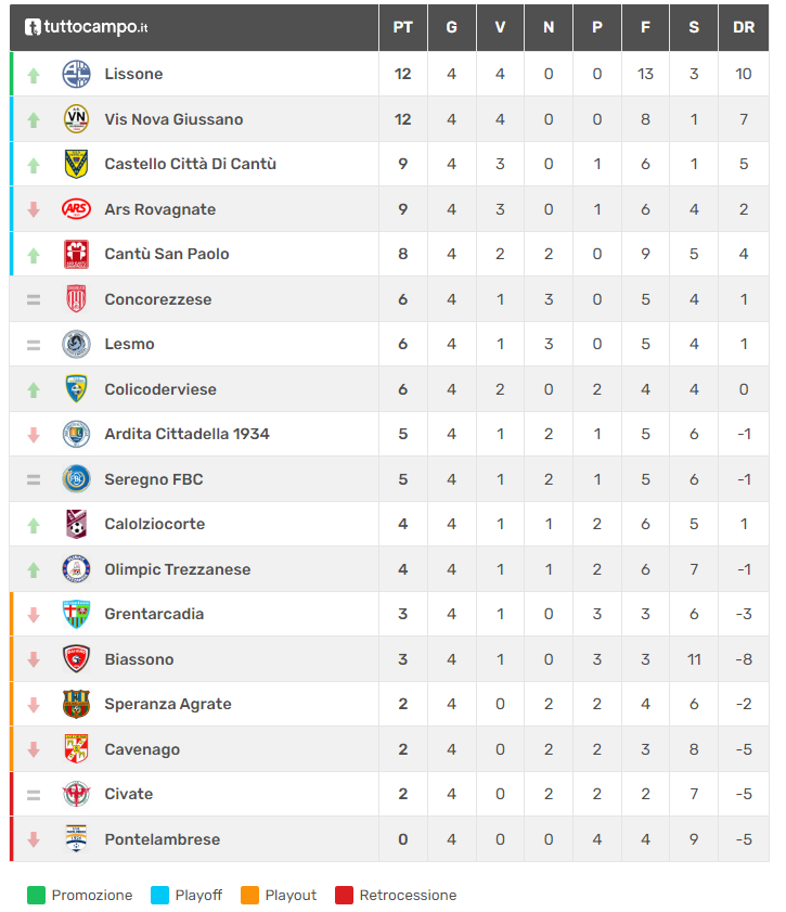 La quarta giornata del girone B di Promozione lombarda propone un corsaro Calolziocorte in casa dell’Ardita Cittadella che prende quattro reti dagli amaranto che vanno a bersaglio con i centrocampisti Todeschini, classe 2000, e l’esperto Bianco oltre che con il difensore 01′ Cotrone e il suo compagno di reparto 29enne Riva che ha sbloccato la gara. Forno, attaccante della squadra di casa, poi manda fuori un tiro dagli 11 metri. Bianco firma lo 0-2 andando deciso sulla ribattuta del rigore calciato dallo stesso centrocampista classe 90′. Prima vittoria stagionale per i ragazzi di mister Perego che domenica affronteranno tra le mura amiche la capolista Lissone a punteggio pieno, situazione in graduatoria condivisa con il Giussano. Calolzio attualmente a quota 4 punti. Da sottolineare anche i tre punti ottenuti di misura dalla ColicoDerviese tra le mura amiche contro l’Agrate grazie ad una rete nel secondo tempo di Fall, attaccante classe 98′ che è subentrato e ha incornato battendo freddamente Landi che, nei primi 45′, aveva parato un rigore di Farina assegnato per l’intervento falloso in area sul centrocampista Raba. I gialloblù sono finora la squadra lecchese meglio classificata nel raggruppamento con 6 punti e due vittorie su due in casa dopo quella realizzata con il Calolziocorte e la sconfitta nel match passato contro il Castello Città di Cantù. Proprio i comaschi hanno fermato il Rovagnate padrone di casa, reduce da tre vittorie su tre, con un doppio sigillo di Traversa, che ha siglato una rete a tempo (una ad inizio gara ed una nel finale), e quello di Campi all’inizio della seconda frazione. Da segnalare il palo del Rovagnate con il prolifico Zorloni sul risultato di 0-1. Il club biancorosso avrà la possibilità di rifarsi con l’Agrate in terra monzese. Pareggio tra Concorezzese e Civate con quest’ultimo che si fa raggiungere al 92′ dalla marcatura di De Ponti preceduta da quella del centrocampista classe 98′ Castagna arrivata al 27′. I biancoverdi ora sono a quota 2 lunghezze e sono prossimi ad affrontare l’ostico Giussano al Fumagalli. Finisce con una sconfitta l’incontro che ha visto sfidarsi Cantù San Paolo e GrentArcadia con la formazione lecchese, al momento a quota 3 punti, che ha gonfiato la rete con Colombo su rigore pareggiando temporaneamente i conti al 14′ dopo il penalty trasformato da Drago. Cima Vivarelli e Canavesi hanno completato l’opera per i biancorossi nella ripresa. Decisivo un rosso a fine primo tempo al difensore ospite Pennati. In attesa della sfida che impegnerà la società di Valgreghentino in casa della Trezzanese.
