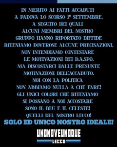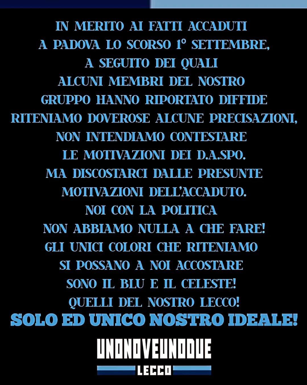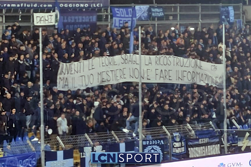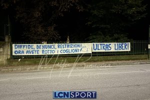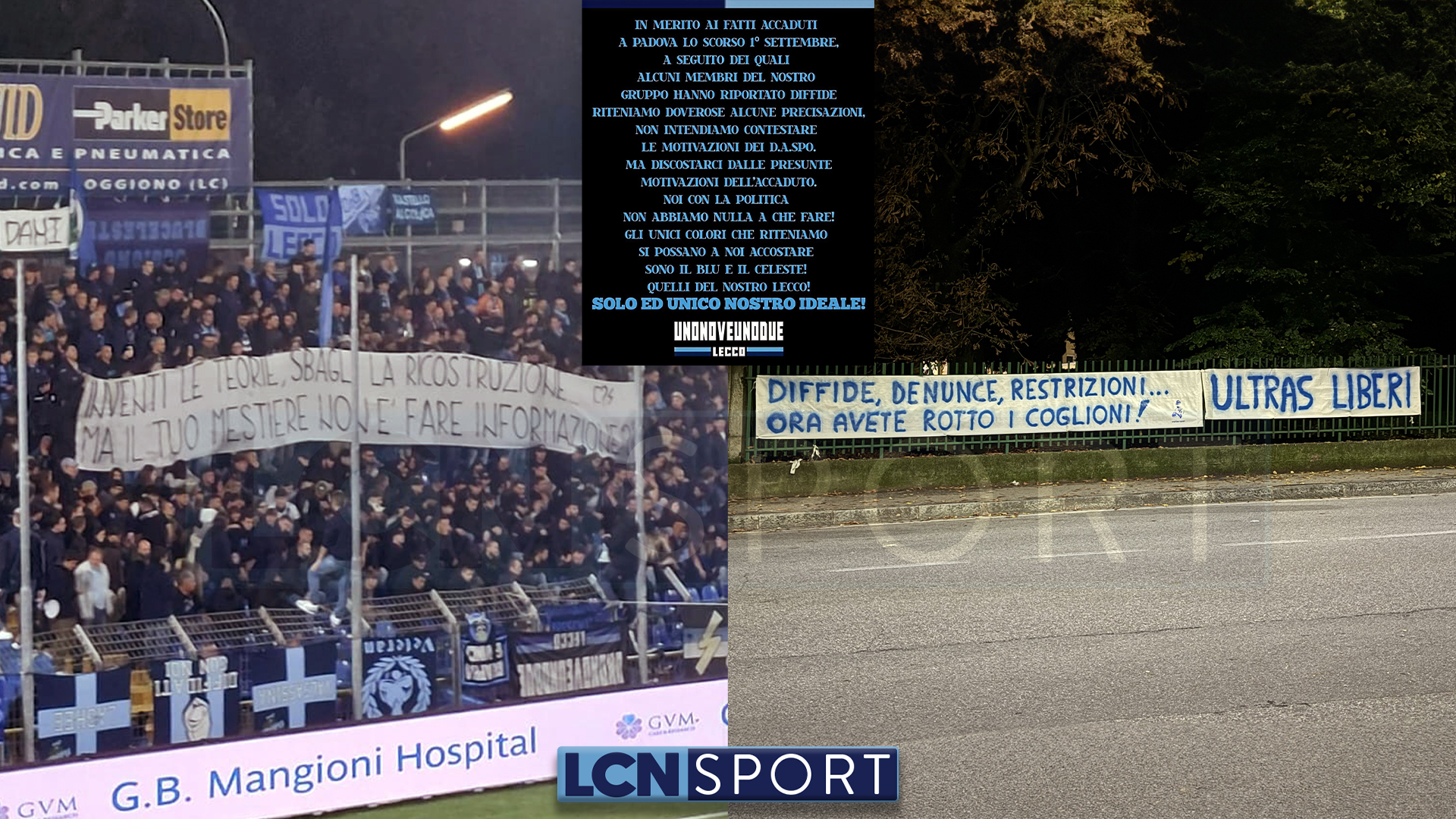 Lecco-Renate è stata la partita in campo, ma non solo. La gara è stata la prima dopo i cinque Daspo firmati dal questore di Padova, Marco Odorisio, per i fatti avvenuti al termine di Trento-Lecco. Lo scorso 1° ottobre è stata proprio la Questura veneta a diffondere una lunga nota contenente le basi che hanno portato all’emissione delle misure di prevenzione che hanno raggiunto vari membri della Curva Nord bluceleste. Nella notte tra giovedì e venerdì hanno iniziato a circolare le prime fotografie legate alla protesta in preparazione: il gruppo Veterani Lecco ha scritto ed esposto in città uno striscione recante il testo “Diffide, denunce, restrizioni… Ora avete rotto i coglioni! Ultras liberi”; il medesimo è stato esposto anche all’esterno del “Rigamonti-Ceppi” durante la gara, installato sulla recinzione che delimita il parco Belgiojoso. Poche ore prima del calcio d’inizio, invece, il gruppo organizzato UnoNoveUnoDue ha diffuso un volantino virtuale attraverso il quale ha preso le distanze dalla matrice politica del gruppo affibbiata dalla Questura di Padova. Infine, a metà del primo tempo i Cani?Sciolti hanno esposto rivolto indirizzato verso i giornalisti (“Inventi le teorie, sbagli la ricostruzione… Ma il tuo mestiere non è fare informazione?”) prima d’intonare dei cori a sostegno della propria tesi. Lecco-Renate – prima, durante e dopo – è stata anche questa.