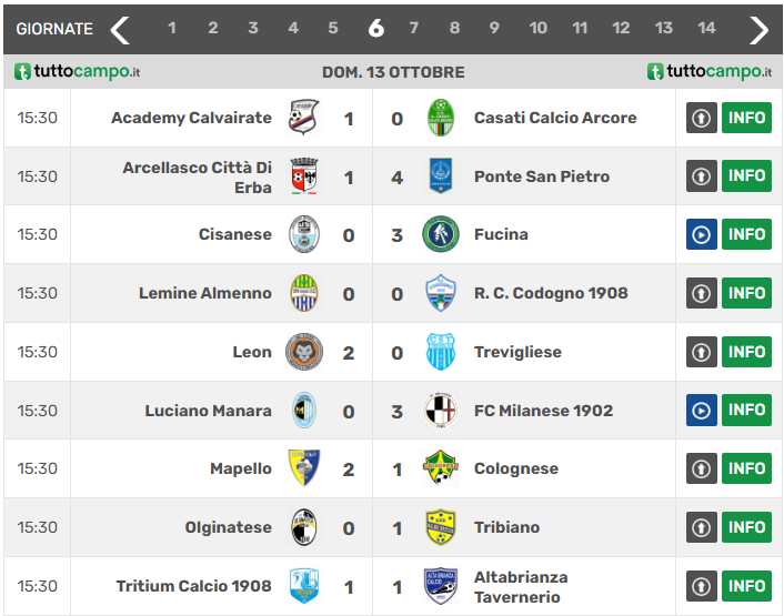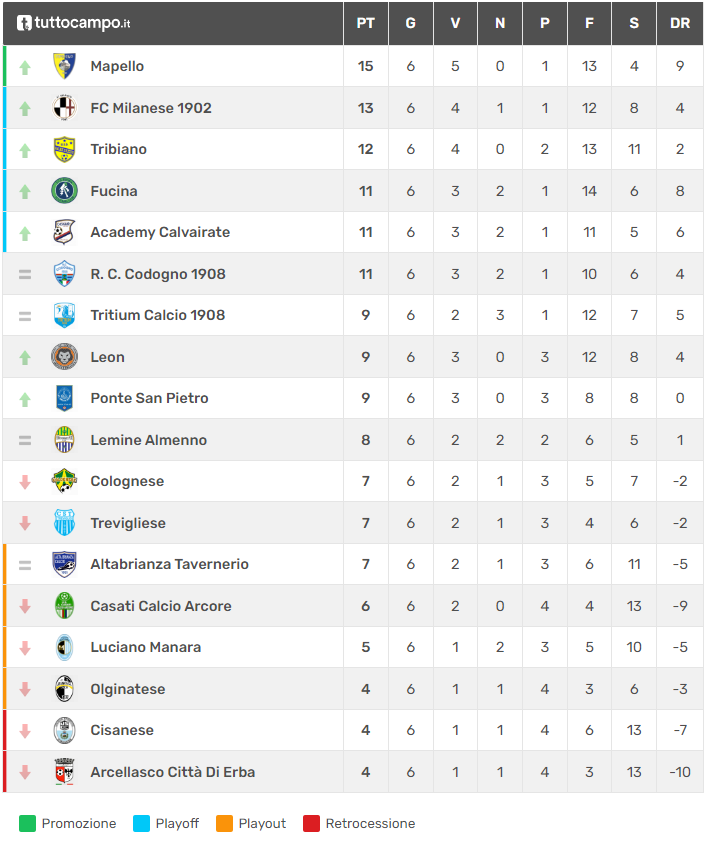 Di seguito la classifica e gli esiti delle sfide della sesta giornata del girone B di Eccellenza lombarda: