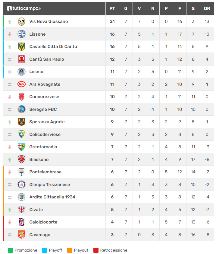 Nell’ultimo turno del girone B di Promozione lombarda, ne esce trionfante soltanto il Civate tra le mura amiche nel derby contro la GrentArcadia che, nella scorsa partita, aveva vinto in modo rocambolesco al Crippa con il Cavenago per 4-3 e rimane nella zona tranquilla della classifica con 7 punti. La rete decisiva per i biancoverdi è stata segnata al 35′ dal difensore classe 1997 Franceschin che ha insaccato con un’efficace incornata un calcio d’angolo. Mister Guadagno ottiene la prima vittoria in campionato salendo a quota 5 punti in zona playout. Al Ferruccio il Seregno pareggia contro il Rovagnate che va a segno con una doppietta del giovane centrocampista Palvarini con un sigillo a tempo. In risposta alle reti biancorosse si fanno sentire i centrocampisti Papapicco, classe 96′, al termine dei primi 45′ e Buccini, classe 99′, nella ripresa. Il Rovagnate, che rimane aggrappato alla zona playoff con 11 punti a pari merito con il Lesmo, attenderà domenica prossima la ColicoDerviese che, in casa, non supera il pareggio contro il Cantù San Paolo: il centrocampista classe 98′ Riolo dal limite con un tiro preciso porta avanti i suoi al quarto d’ora di gioco, ma ad inizio ripresa Redaelli, centrocampista 22enne, fa centro per i gialloblù che rimangono in 10 uomini dal 60′ per l’espulsione di un altro elemento in mezzo al campo ovvero Viganò. Dunque la ColicoDerviese si issa a quota 9 a pari merito con l’Agrate e colleziona il terzo pareggio consecutivo ed il quarto risultato utile consecutivo. A Calolziocorte la formazione locale subisce un poker dalla capolista Vis Nova Giussano che dirige l’incontro con le reti di Morotti, nel primo tempo, e di Innocenti su rigore, Tranquillini e Zatti nella seconda metà di gara. Da segnalare il palo di Todeschini per i padroni di casa al 28′. Questa sconfitta fa scivolare gli amaranto in zona retrocessione a quota 4 lunghezze.