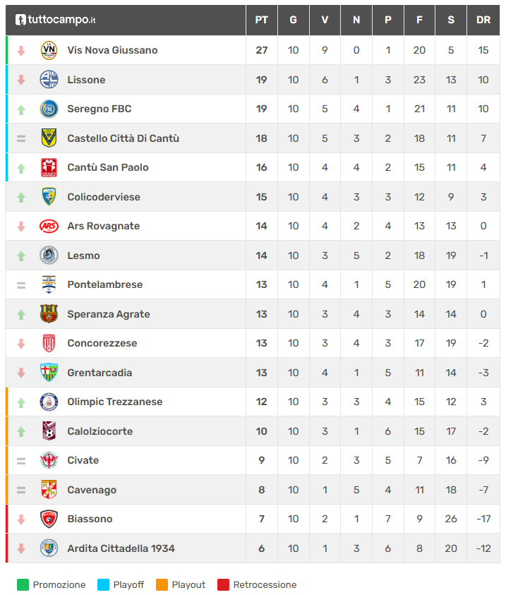 Il turno domenicale del girone B di Promozione lombarda regala gioie soprattutto alla ColicoDerviese e al Calolziocorte, ma anche al Civate che realizza un pareggio a reti inviolate. Nello specifico la società gialloblù è quello meglio posizionata tra le lecchesi con 15 punti a distanza minima dai playoff occupati dal Cantù San Paolo grazie ai tre punti conquistati cinicamente di misura tra le mura amiche contro il fanalino di coda Ardita Cittadella, che gioca una buona gara. Sblocca la sfida l’espulsione di Righetto tra le fila comasche e un gol dagli 11 metri in extremis di Redaelli, centrocampista classe 2002, preceduto da quello parato da Sanvito su Longoni a metà seconda frazione. Poco prima del vantaggio, i padroni di casa colpiscono anche un palo e, al triplice fischio, il secondo bottino pieno di fila dopo il tris calato al Colico Piano al Civate nell’infrasettimanale. Il Calolziocorte totalizza invece una vittoria per 2-0 in casa contro la GrentArcadia che ha colpito un legno con la zuccata del difensore 96′ Maggi: il centrocampista 2000 Todeschini porta avanti i suoi al quarto d’ora con freddezza e scaltrezza e, su rigore, al 35′ del secondo tempo c’è il raddoppio amaranto con l’offensivo Lozza e dunque i secondi tre punti in una settimana vista la roboante vittoria di Lesmo per 2-5. Risultati positivi che portano la banda Perego in zona playout e a meno tre dal gruppo salvezza in cui si trova anche la GrentArcadia che, nella giornata precedente, aveva battuto a sorpresa in trasferta il Lissone, attualmente secondo con il Seregno, con la rete decisiva di Ghezzi nella ripresa. Invece i ragazzi di mister Guadagno, al momento nella fascia degli spareggi salvezza con 9 punti, conquistano un punto a reti bianche contro il Cavenago al Fumagalli. Il club che invece è rimasto senza punti sia nel turno del mercoledì che della domenica è il Rovagnate che ha perso entrambi i match per 1-2 rispettivamente con Cavenago e Cantù San Paolo: in particolare contro quest’ultimi non è bastata la marcatura di Rompani, attaccante classe 97′, al 78′ dato che Drago ha ribadito nello specchio la palla che ha messo una pietra sopra all’incontro al minuto 88. I biancorossi, nonostante la terza sconfitta di seguito, si collocano a 14 punti e a due lunghezze dalla zona playoff.