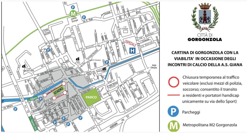 Come stabilito in sede di GOS, l’A.S. Giana Erminio comunica che in occasione della gara contro il Lecco di sabato 16 novembre (ore 17:30) allo stadio comunale “Città di Gorgonzola”, per i tifosi OSPITI sono stati riservati i seguenti parcheggi, indicati nella mappa: