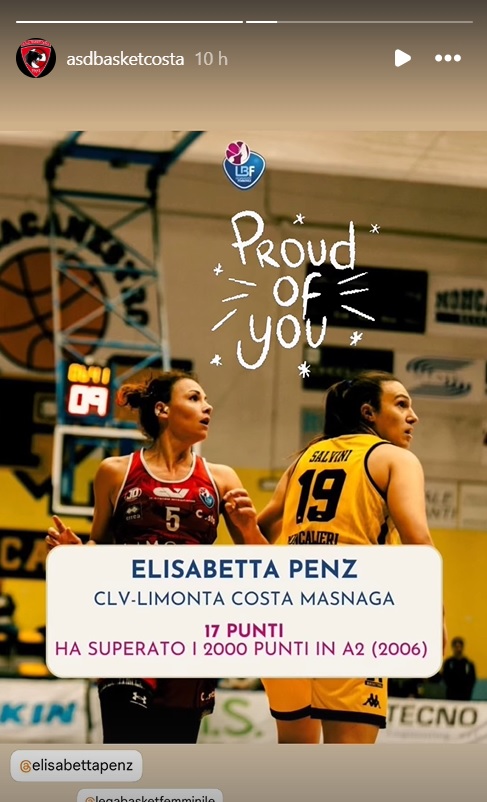 Un traguardo prestigioso, festeggiato mercoledì sera, dopo la vittoria di Costa Masnaga a Moncalieri. Elisabetta Penz ha superato quota 2.000 punti segnati in Serie A2 in carriera.