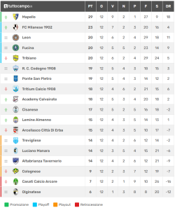 Di seguito vengono proposti la graduatoria e gli ultimi esiti del girone B di Eccellenza lombarda: