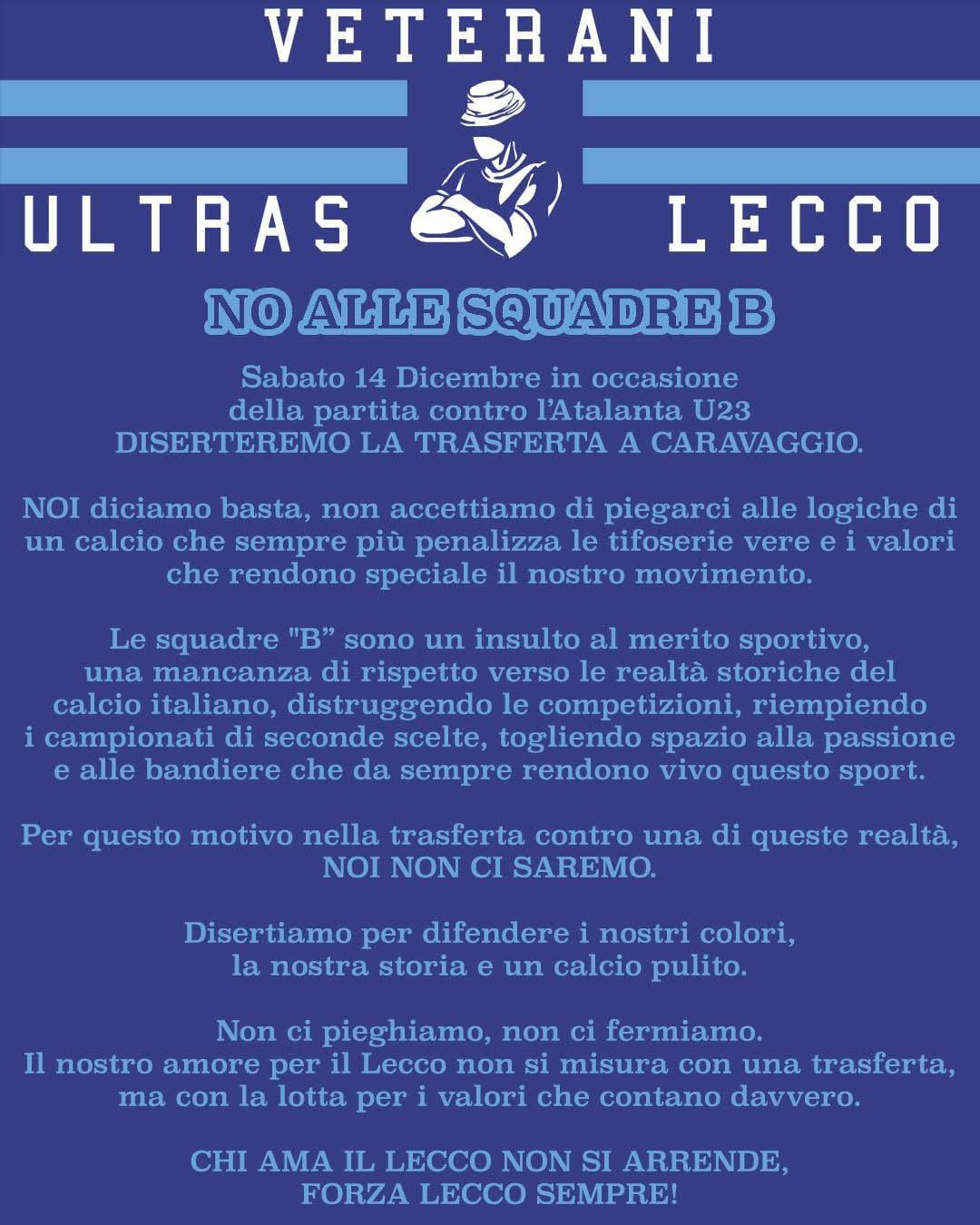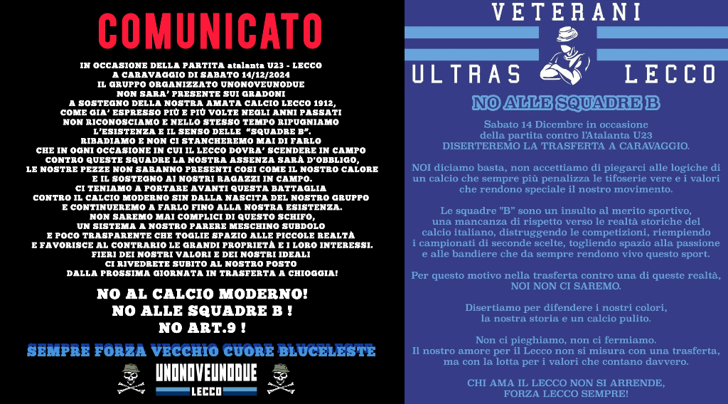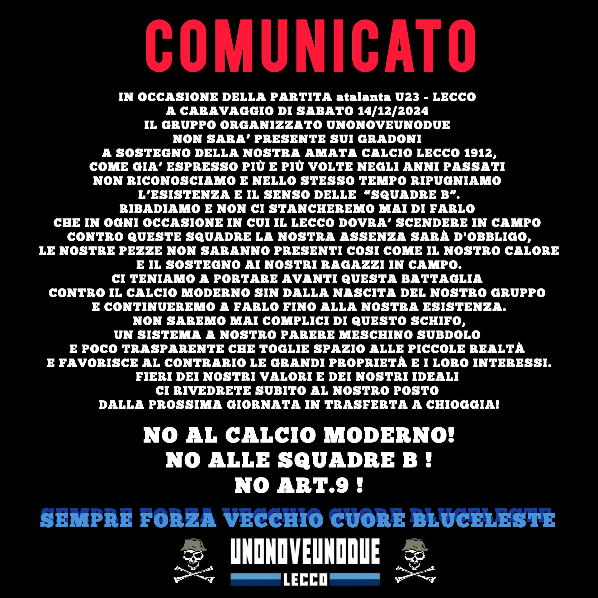 Atalanta U23-Lecco avrà una cornice di tifo diversa. Notoriamente le gare con le seconde squadre si portano dietro un hype diverso per quanto riguarda ciò che succede all’esterno del terreno di gioco: dal 2018 in avanti, quando è stata creata l’allora Juventus U23 poi diventata Next Gen, svariate tifoserie italiane hanno deciso di non prendere parte alle gare in trasferta contro le compagini in questione. Protesta che prosegue ancora ed è stata portata avanti anche a Lecco: durante le gare interne, infatti, sono stati esposti striscioni di dissenso contro le squadre B, così come alcuni gruppi organizzati hanno deciso di non recarsi ad Alessandria. La solfa non cambierà a Caravaggio: i gruppi UnoNoveUnoDue e Veterani Lecco hanno diffuso dei comunicati per far annunciare lo sciopero del tifo in vista del match di sabato. Dovrebbero essere presenti, invece, i Cani?Sciolti così come avvenuto contro i bianconeri il 20 febbraio 2023.