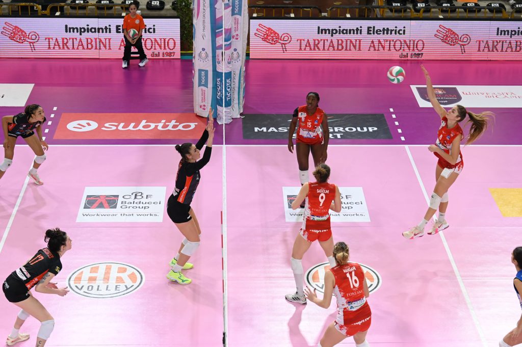 Primo set nel segno di Battista (7 punti con il 54%) e Mazzon (4 con l’80%): la pressione al servizio delle arancionere e le migliori percentuali di attacco regalano l’1-0 alla CBF Balducci HR con il 25-20 finale. Ancora più netta l’affermazione delle maceratesi nel secondo set: ancora Battista sugli scudi con 7 punti e il 70%, più una battuta sempre efficace delle padrone di casa sanciscono il 25-15 finale. Sulla stessa linea il terzo set, con una formazione inedita le arancionere tengono alta la concentrazione e chiudono senza problemi 25-19.