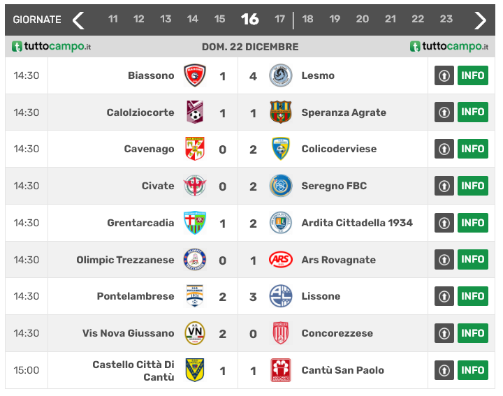 Nell’ultimo atto della prima parte di campionato del girone B di Promozione lombarda ColicoDerviese e Rovagnate portano a casa un bottino pieno esterno, mentre il Calolziocorte non va oltre il segno X