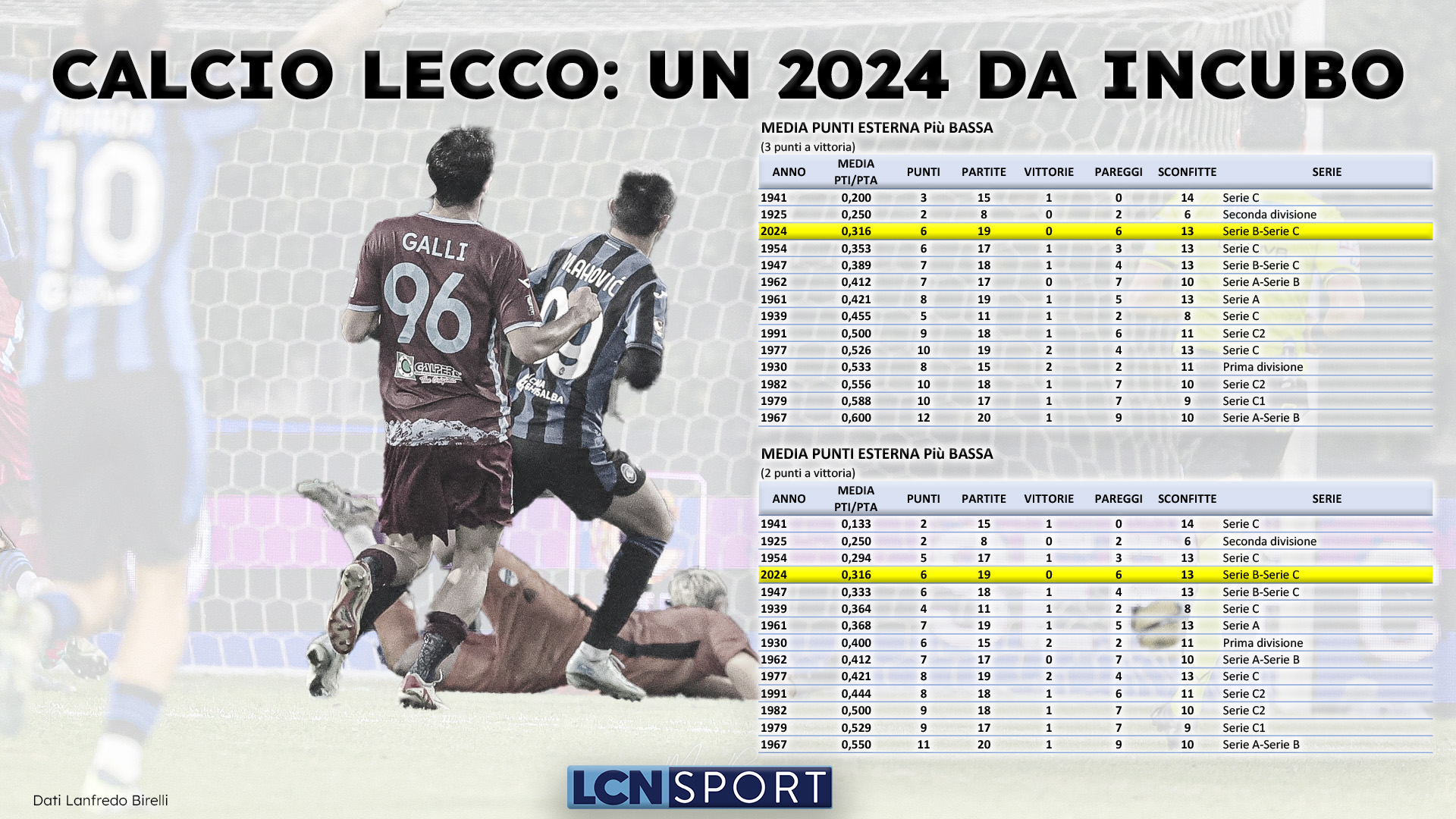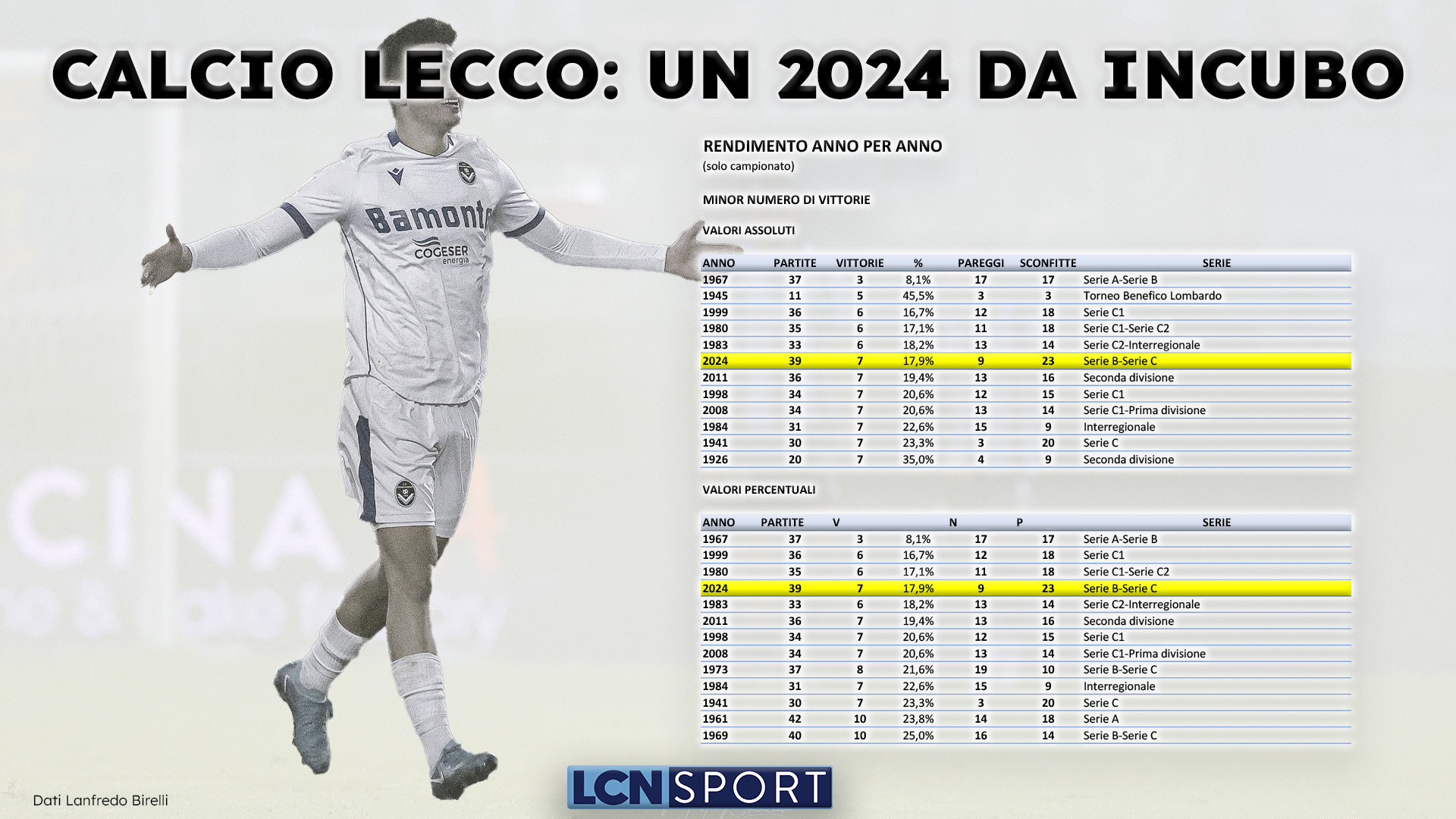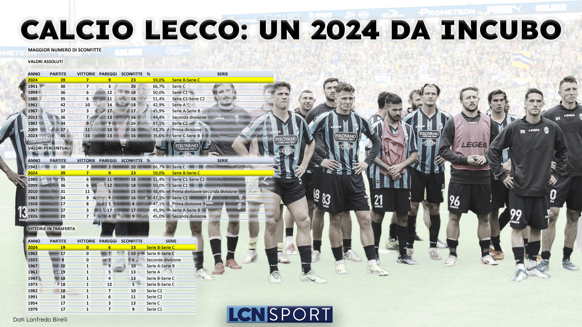 Ci sono le sensazioni e ci sono i numeri, evidentemente legati indissolubilmente. Entrambi dicono la stessa, identica cosa: il 2024 della Calcio Lecco è stato terribile. Del resto solo così si può definire un periodo lungo 40 partite e in grado di portare in dote la miseria di 7 vittorie e l’82,5% di gare non vinte – 9 pareggi e 24 sconfitte -, Coppa compresa. I blucelesti sono stati la peggiore compagine per distacco della Serie B e rappresentano una delle grandi delusioni della Serie C, “vantando” un secco -35 alla voce differenza reti: che questo anno solare se ne vada in archivio è, sempre sportivamente parlando, solamente positivo.