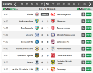 Al rientro dalle vacanze natalizie le compagini del girone B di Promozione lombarda si riaccendono sui terreni di gioco per il girone di ritorno: il blasonato Seregno, momentaneamente secondo con 34 punti, ha subito uno stop al Ferruccio contro un Calolziocorte oramai ripreso che lo ha bloccato sullo 0-0 dopo tre bottini pieni consecutivi. I Perego boys raggiungono quindi il quinto risultato utile consecutivo includendo le vittorie con Biassono, Castello e Cantù San Paolo. La ColicoDerviese, che è a -3 dai playoff con 28 punti, cade per 1-2 contro il Biassono a Cortenova dopo le vittorie con Trezzanese e Cavenago: la formazione lecchese era partita con il piglio giusto grazie al gol di Raba, centrocampista classe 1996, al 9′. Al 27′ però si fanno vedere anche i monzesi con il sigillo dell’offensivo 2006 Zhuja. Nella seconda frazione giunge il raddoppio ospite con l’attaccante Politi che trasforma un penalty al 61′. La Concorezzese trafigge di misura la GrentArcadia a quota 24 punti nella trasferta di Valgreghentino grazie a una marcatura di Lo Re, attaccante 98′, al minuto 8 della ripresa. Ci ha provato Esposito di testa nel finale, ma l’esperto difensore goleador ha mancato la gioia della rete del pari colpendo il palo. Il derby locale Civate-Rovagnate è stato infine posticipato a mercoledì 15 gennaio alle 21 a Costamasnaga e ostacolato dal campo del Fumagalli considerato troppo ghiacciato dall’arbitro per essere praticabile.