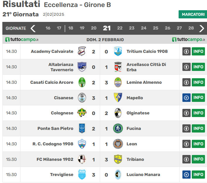 Classifica e risultati del girone B di Eccellenza lombarda