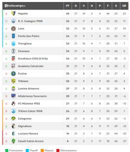 In terra bergamasca la Luciano Manara, dopo il pareggio casalingo con l’ostica Cisanese, subisce 3 reti dall’altrettanto tosta Trevigliese. La sconfitta costa cara alla banda Sibio che si ritrova in fascia retrocessione con 16 punti venendo così scavalcata dai rivali dell’Olginatese vincenti sul campo della Colognese e a quota 18 punti. I padroni di casa salgono in cattedra al 21′ con Pesenti, esperto attaccante. Nei secondi 45′ giunge il raddoppio della Trevigliese al 59′ con Meda, difensore classe 2004. Al 70′ la squadra di mister Lucchi Tuelli realizza, con la complicità del palo, il tris di testa con Ruggeri, elemento classe 2001 facente parte del reparto arretrato della formazione casalinga, dagli sviluppi di una punizione.