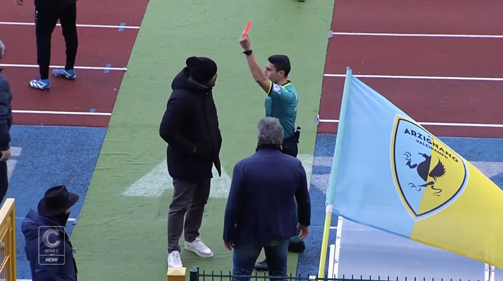 per avere, al 45° minuto del primo tempo, tenuto una condotta irriguardosa e ingiuriosa nei confronti dell’Arbitro in quanto pronunciava una frase irrispettosa e offensiva nei suoi confronti, ripetuta per tre volte, per contestarne l’operato. Ritenuta la continuazione misura della sanzione in applicazione degli artt.13, comma 2, e 36, comma 1, lett. a), C.G.S., valutate le modalità complessive della condotta (r. Arbitrale, supplemento r. Arbitrale, panchina aggiuntiva).