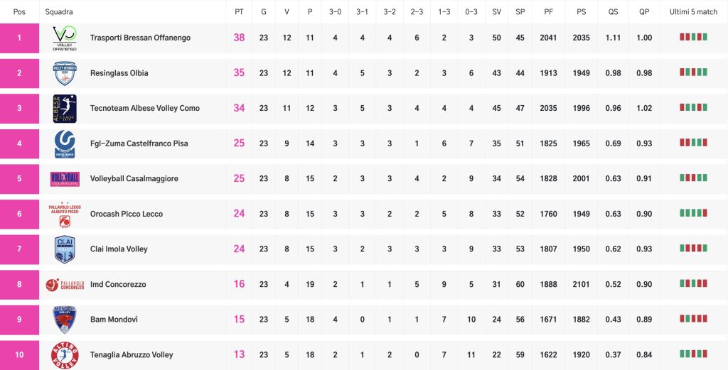 Le speranze di una rimonta si sono però spente nel quarto set, quando la Resinglass Olbia ha ripreso in mano le redini dell’incontro, chiudendo agevolmente con un 25-15 che non ha lasciato scampo alle lecchesi. La vittoria permette alla formazione sarda di consolidare il secondo posto in classifica con 35 punti, a soli tre punti di distanza dalla capolista Trasporti Bressan Offanengo.