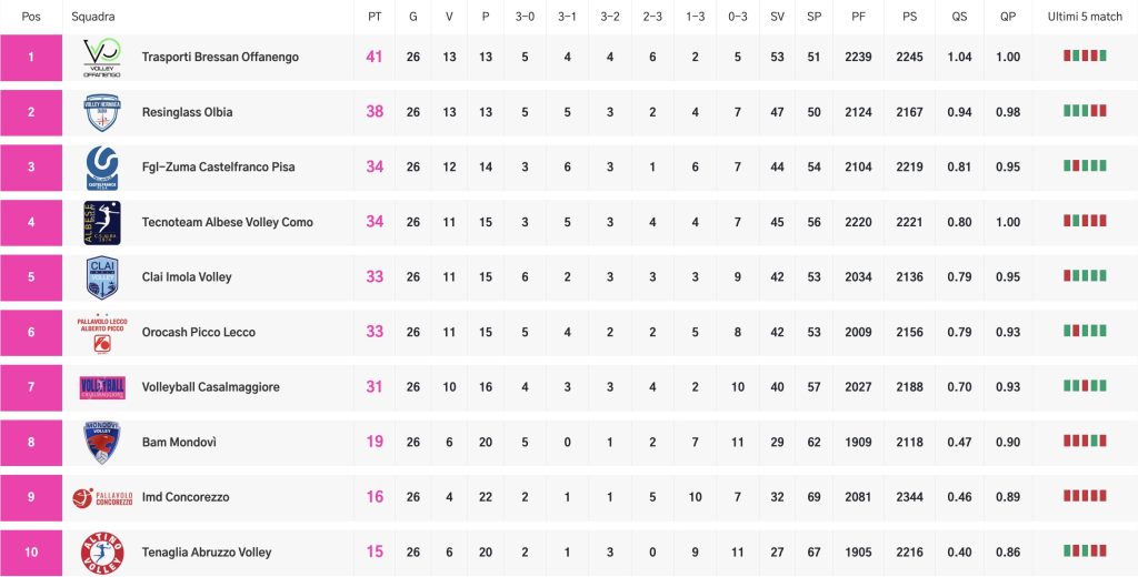La classifica della Pool Salvezza si fa sempre più intrigante, con cinque squadre racchiuse in appena due punti. La Trasporti Bressan Offanengo guida la graduatoria con 41 punti, seguita da Resinglass Olbia (38), Fgl-Zuma Castelfranco Pisa e Tecnoteam Albese Volley Como (entrambe a 34), Clai Imola Volley e Orocash Picco Lecco (33) e Volleyball Casalmaggiore (31): a parte le prime due, tutte le altre dovranno sudare fino all’ultimo pallone. Le ultime due giornate saranno decisive per stabilire quale sarà la quarta squadra a retrocedere in Serie B1, insieme alle già condannate Bam Mondovì (19), Imd Concorrezzo (16) e Tenaglia Abruzzo Volley (15).