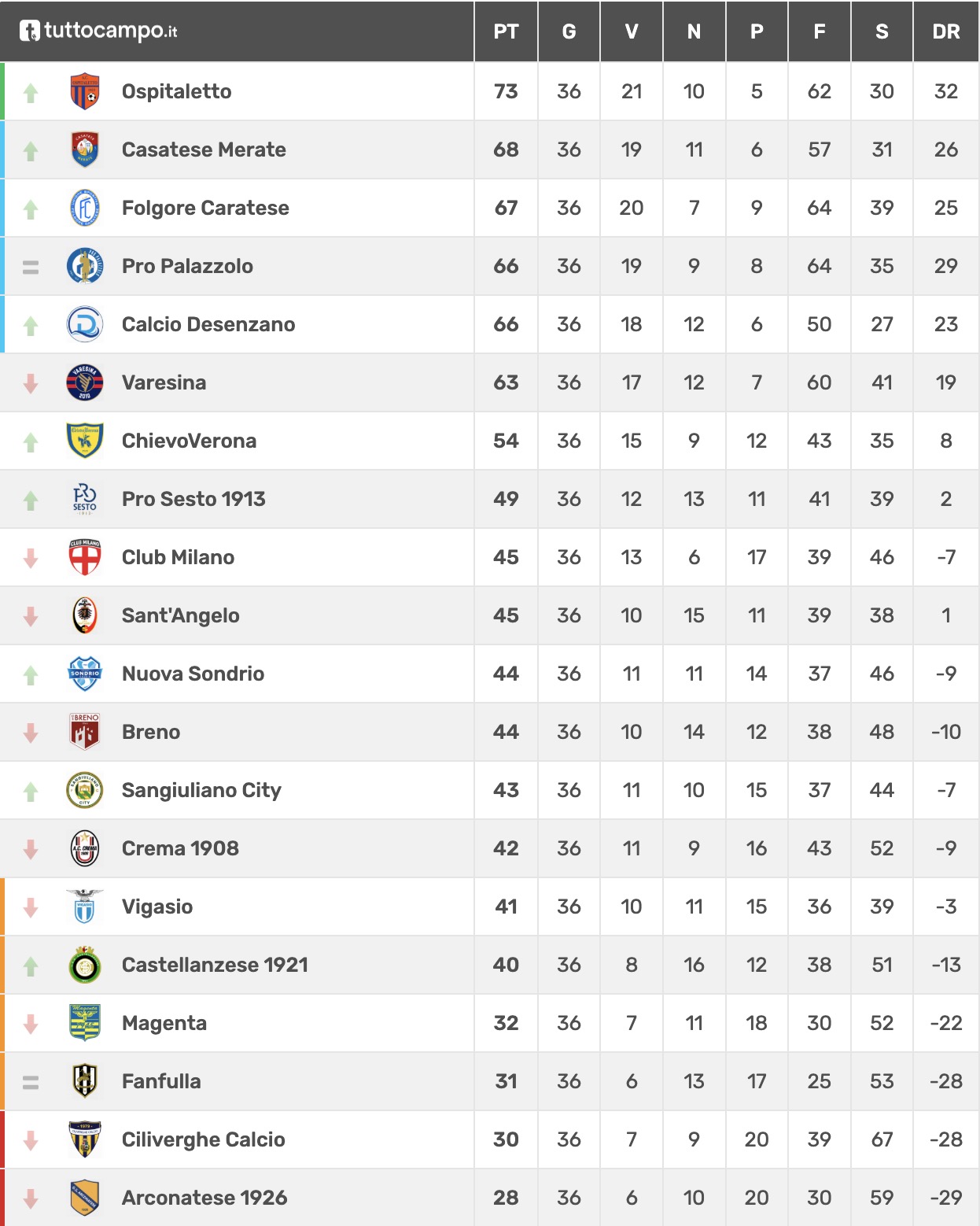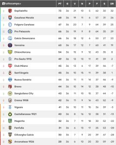 La classifica ora sorride alla formazione brianzola che, grazie a questa vittoria, sale al secondo posto con 68 punti (0-0 a Lodi per la Pro Palazzolo), alle spalle della capolista Ospitaletto (73 punti) e davanti a Folgore Caratese (67). Con solo due giornate al termine del campionato, la Casatese si trova in una posizione privilegiata nella serrata corsa ai play off, potendo contare su un ottimo stato di forma: la squadra guidata da Commisso e allestita dal diesse Alberto Rho sta attraversando un momento magico, come dimostra la serie di risultati positivi nelle ultime partite, e il successo di Venegono Superiore potrebbe rappresentare un punto di svolta decisivo nella stagione. Il calendario ora prevede gli ultimi due impegni con Desenzano e Sant’Angelo.