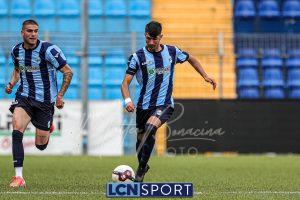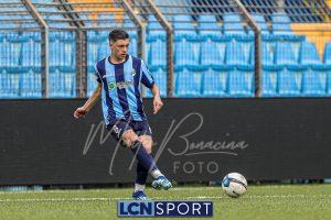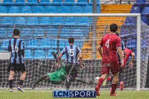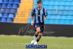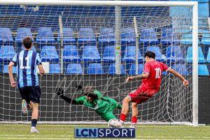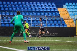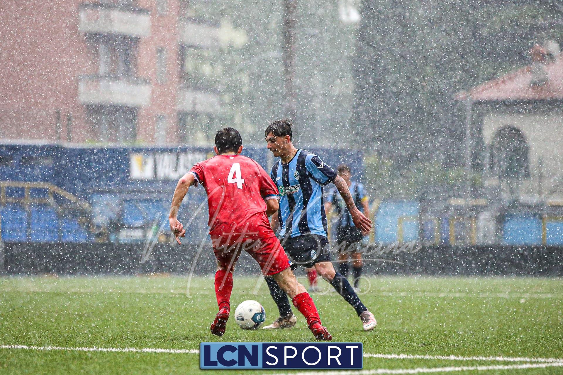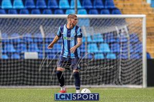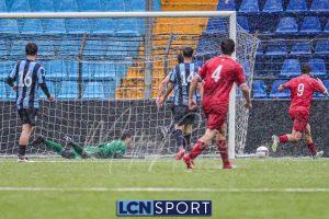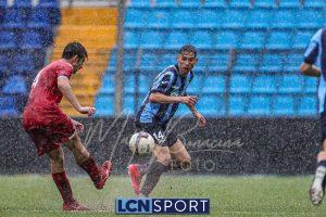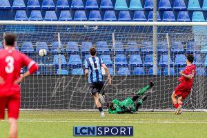 Gli ospiti, guidati dall’ex centrocampista bluceleste Francesco Bolzoni, non stanno a guardare e si propongono con pericolosità, sfruttando anche i calci piazzati. Il momento decisivo arriva a tre minuti dall’intervallo: Auci viene atterrato in area dopo essere scattato in posizione di probabile fuorigioco e conquista un rigore. Dal dischetto, l’attaccante si fa inizialmente ipnotizzare da Constant, ma è il più lesto ad avventarsi sulla ribattuta, portando in vantaggio i bustocchi. Da segnalare che lo stesso “10” ospite viene poi sostituito da Bolzoni al termine della prima frazione per l’ammonizione ricevuta a causa di un eccesso di irriverenza nei confronti di Di Bitonto dopo un duello davanti alla panchina lecchese.