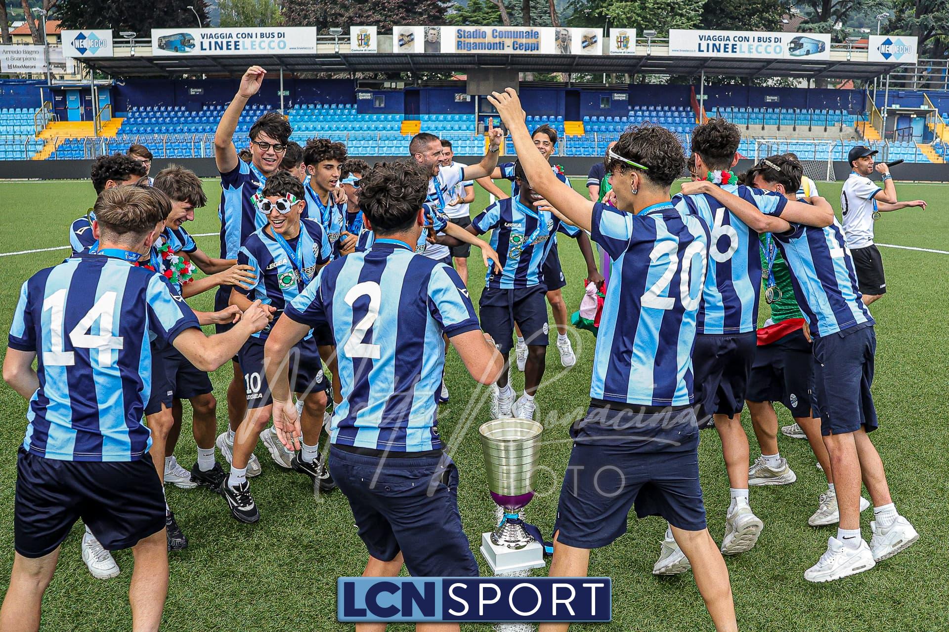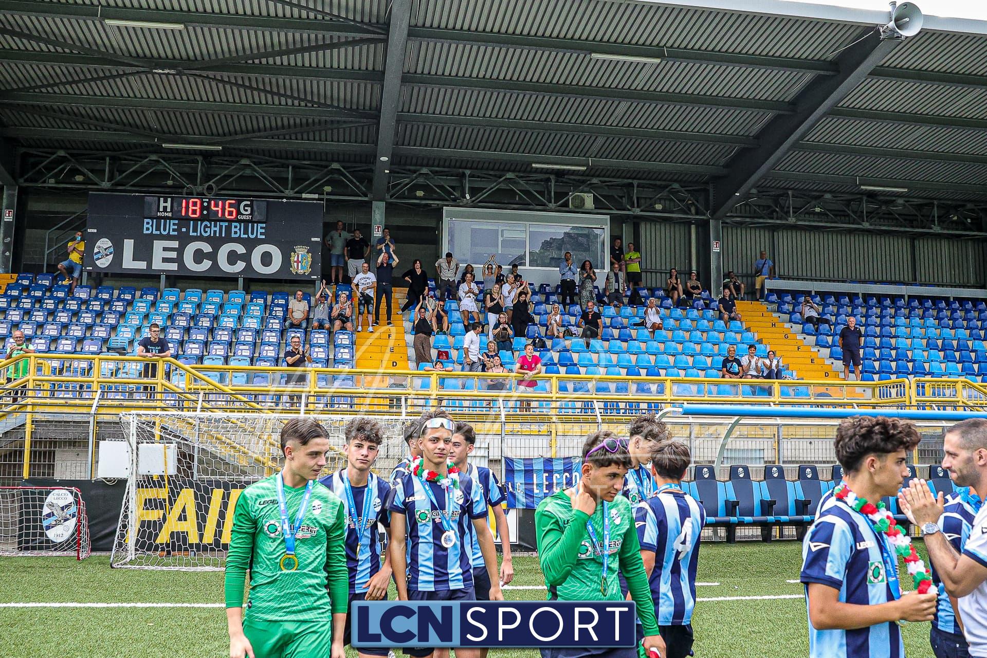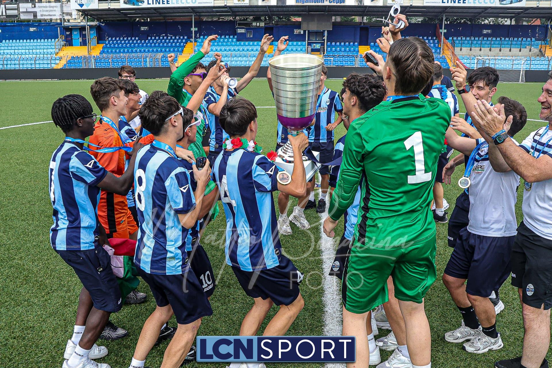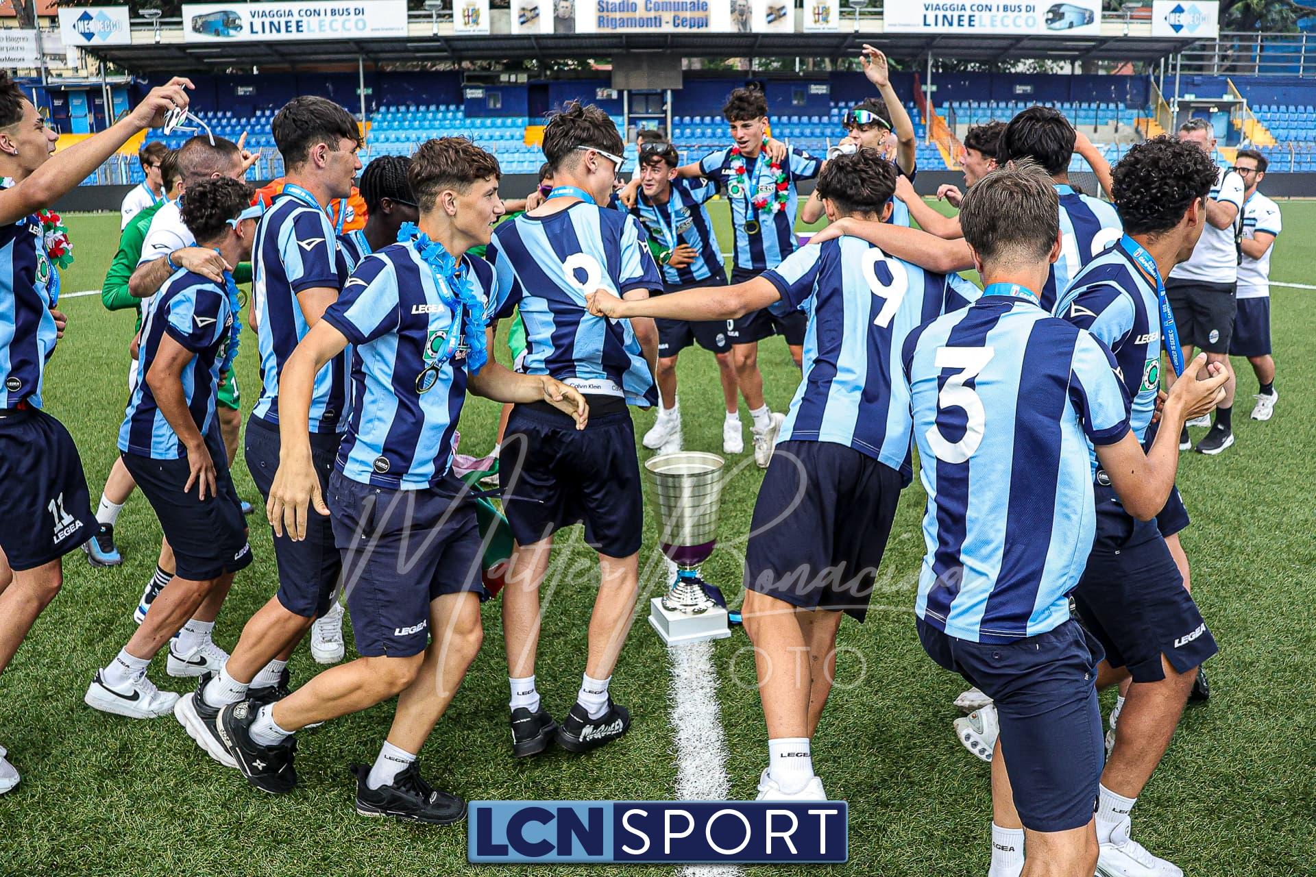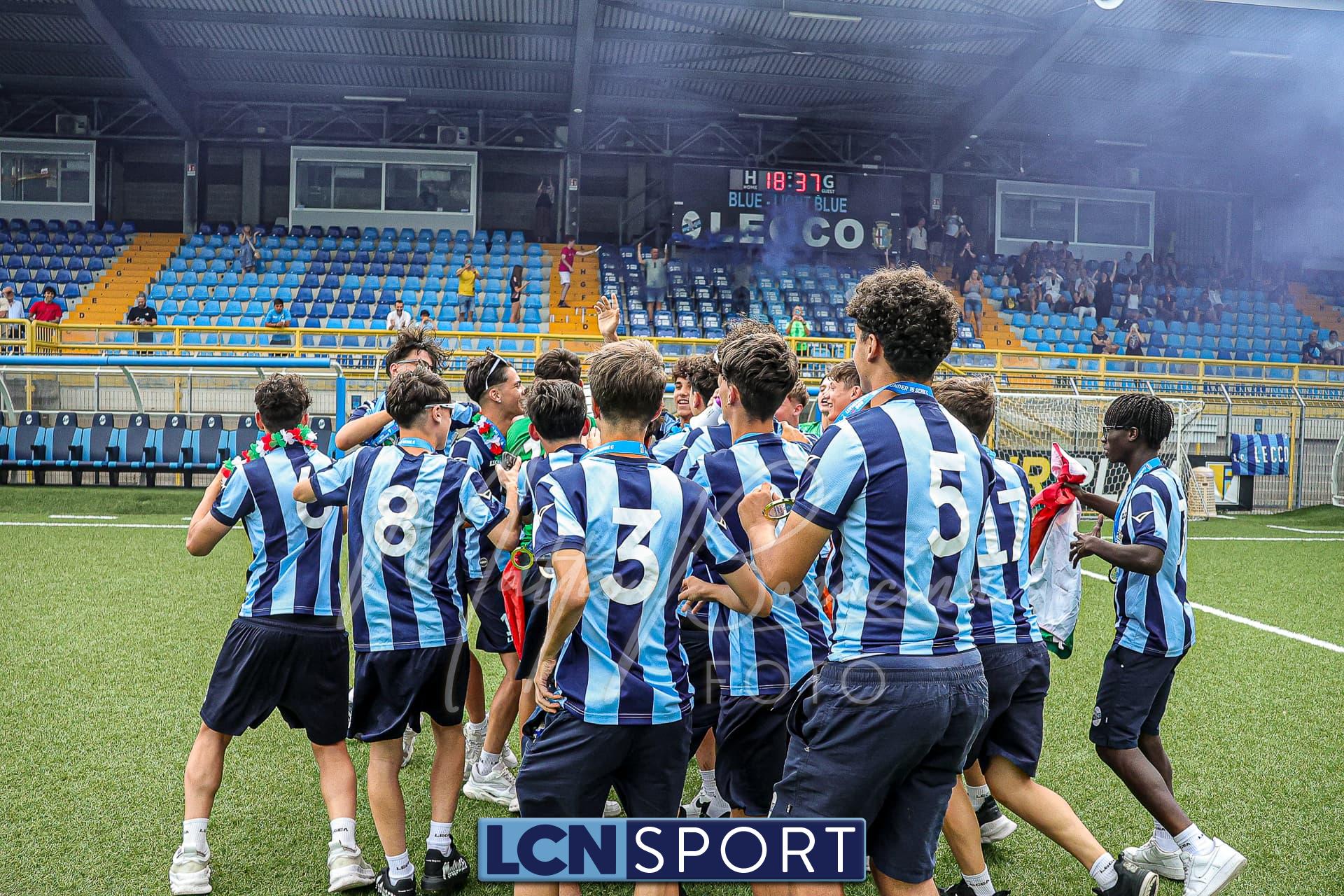 Ultimo atto per la splendida Under 15 della Calcio Lecco 1912. Intorno alle 18, con la tradizionale “strombazzata” celebrativa dell’autista Domenico La Rocca, la delegazione bluceleste ha fatto rientro al “Rigamonti-Ceppi” con lo Scudetto tra le mani del segretario Marco Bolis. Il coloratissimo gruppo guidato da mister Alessandro Vicinanza Toscano si è quindi spostato negli spogliatoi per poi fare il proprio ingresso sul terreno di gioco alla spicciolata annunciati dallo speaker Maurizio Barbuto: a chiudere la sfilata capitan Giacomo Fellini, che ha alzato il trofeo alto nel cielo di Lecco. Non sono mancati canti, balli e i doverosi ringraziamenti per tutti coloro che hanno dato il proprio contributo alla realizzazione di un’impresa straordinaria – dal presidente Aliberti in giù -, frutto del lavoro profuso nel corso di «168 sedute d’allenamento, 35 gare ufficiali, con 28 vittorie e 139 gol segnati, 4 di media a partita». Al termine della cerimonia il gruppone si è spostato allo Shamrock Irish Pub di via Parini per la prosecuzione dei festeggiamenti: ultimo atto per una stagione meravigliosa.