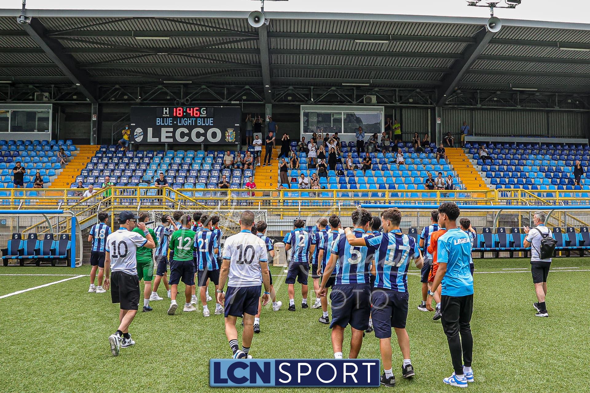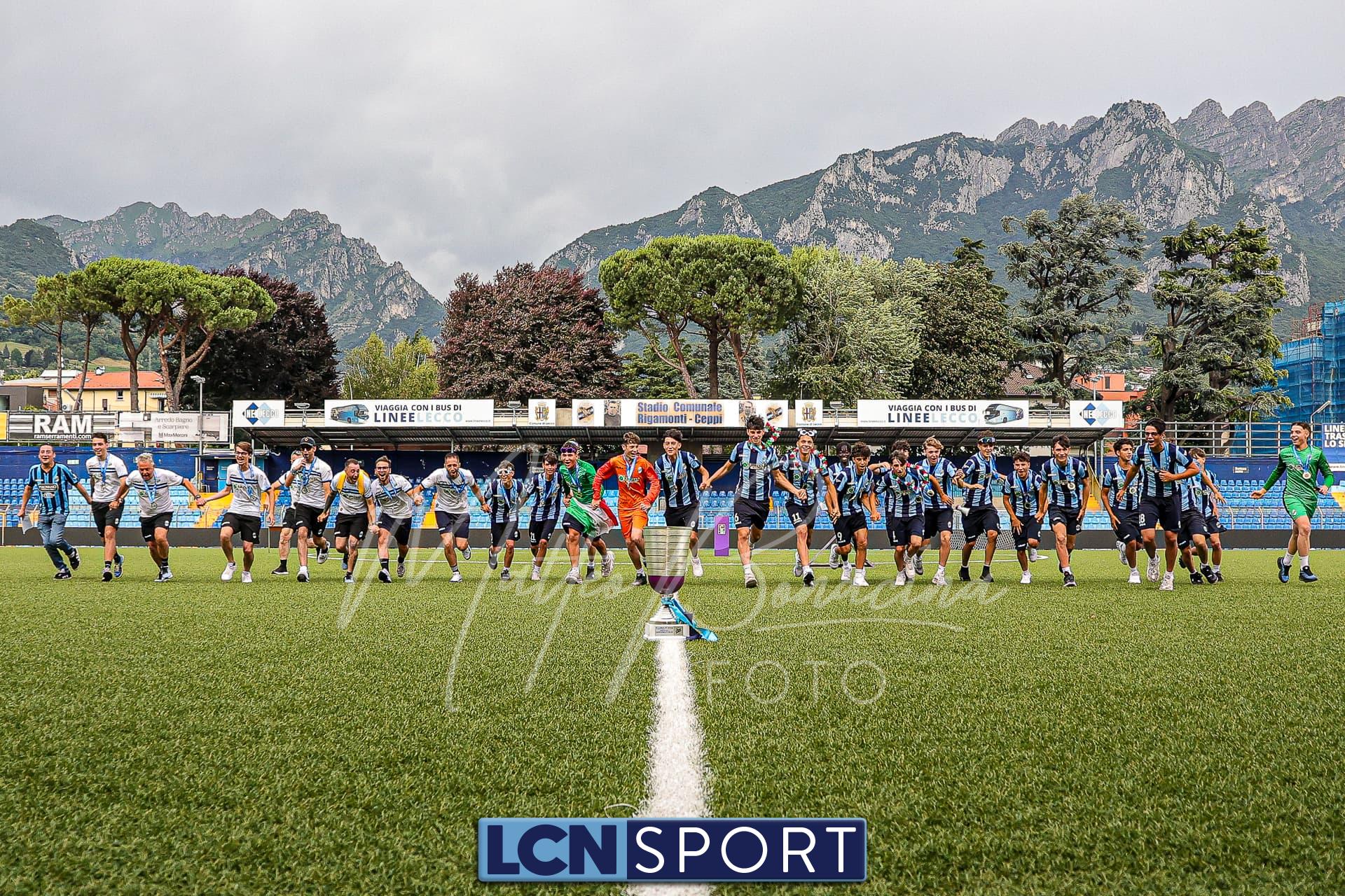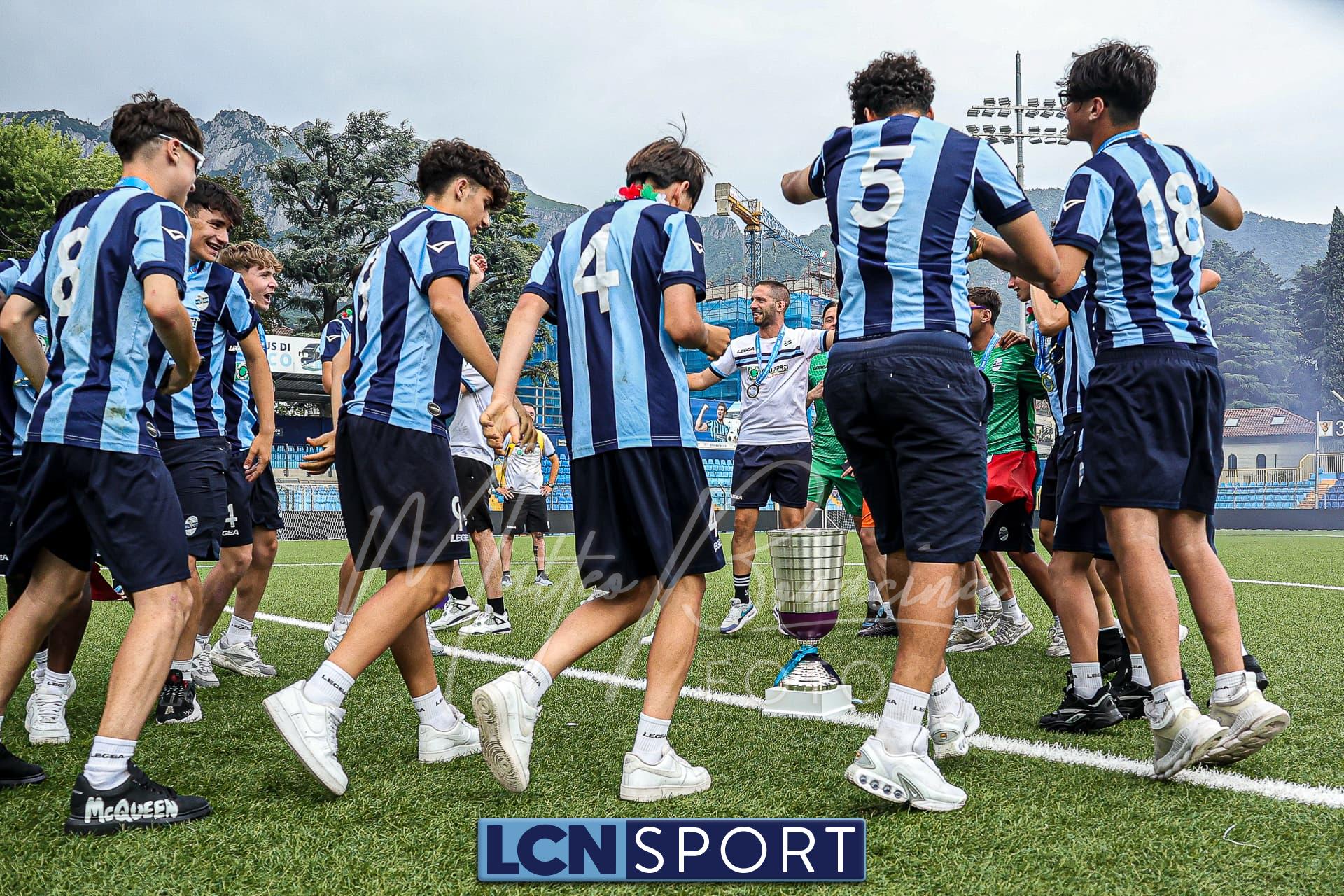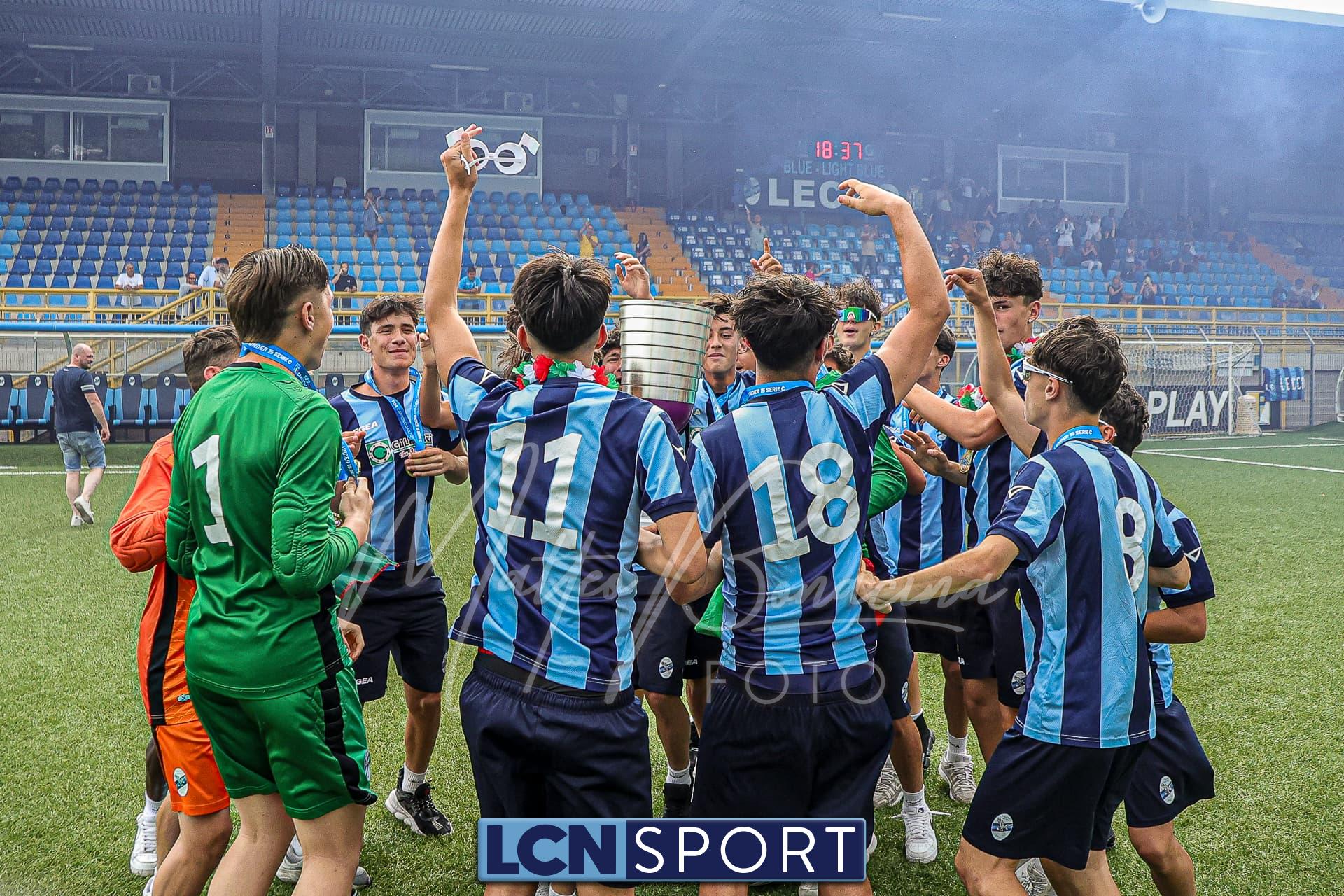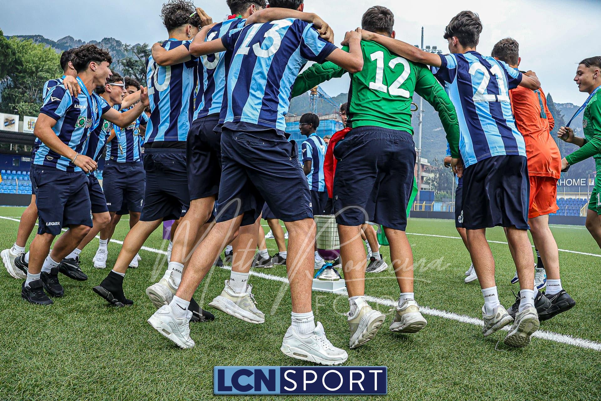 Ultimo atto per la splendida Under 15 della Calcio Lecco 1912. Intorno alle 18, con la tradizionale “strombazzata” celebrativa dell’autista Domenico La Rocca, la delegazione bluceleste ha fatto rientro al “Rigamonti-Ceppi” con lo Scudetto tra le mani del segretario Marco Bolis. Il coloratissimo gruppo guidato da mister Alessandro Vicinanza Toscano si è quindi spostato negli spogliatoi per poi fare il proprio ingresso sul terreno di gioco alla spicciolata annunciati dallo speaker Maurizio Barbuto: a chiudere la sfilata capitan Giacomo Fellini, che ha alzato il trofeo alto nel cielo di Lecco. Non sono mancati canti, balli e i doverosi ringraziamenti per tutti coloro che hanno dato il proprio contributo alla realizzazione di un’impresa straordinaria – dal presidente Aliberti in giù -, frutto del lavoro profuso nel corso di «168 sedute d’allenamento, 35 gare ufficiali, con 28 vittorie e 139 gol segnati, 4 di media a partita». Al termine della cerimonia il gruppone si è spostato allo Shamrock Irish Pub di via Parini per la prosecuzione dei festeggiamenti: ultimo atto per una stagione meravigliosa.
