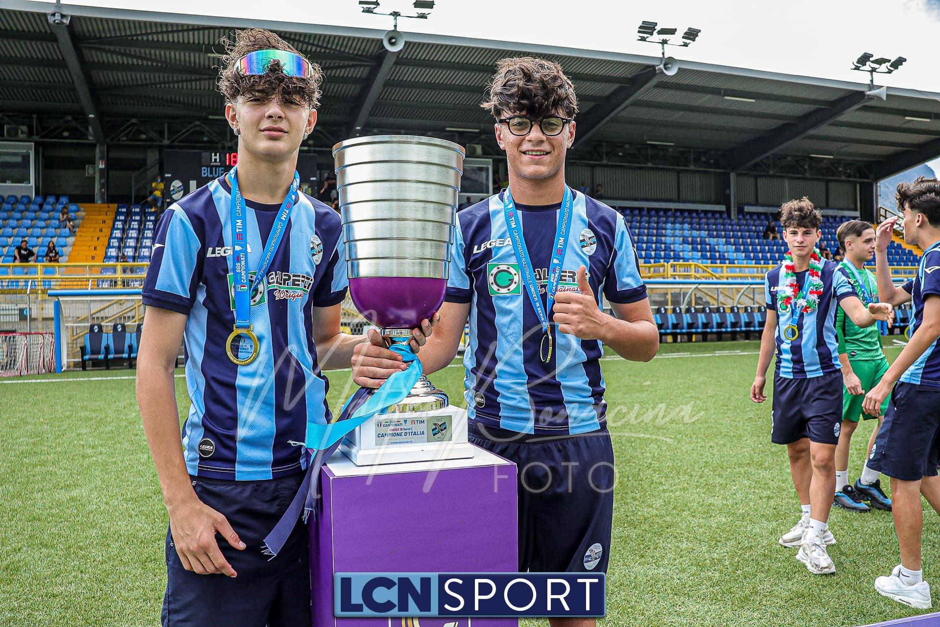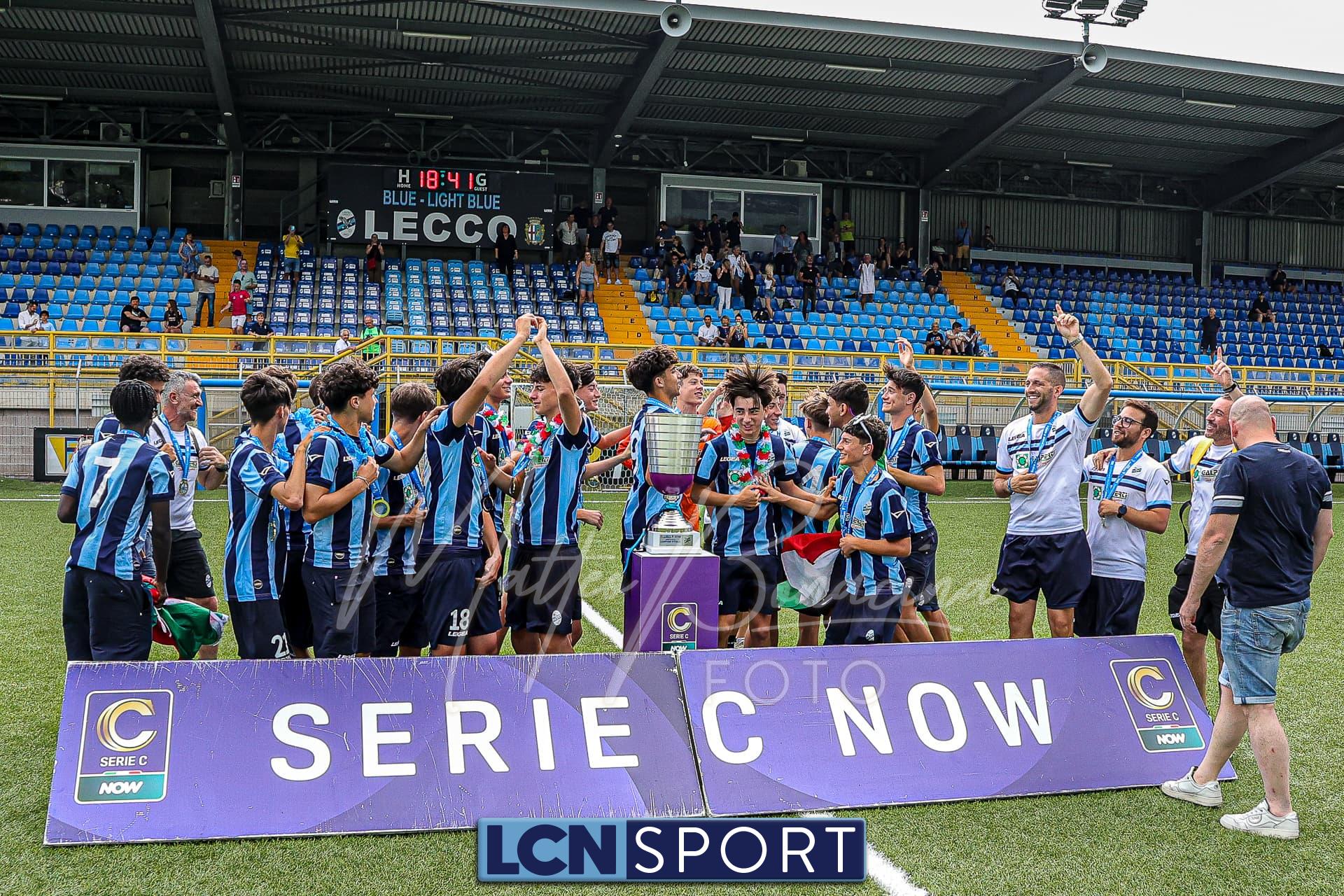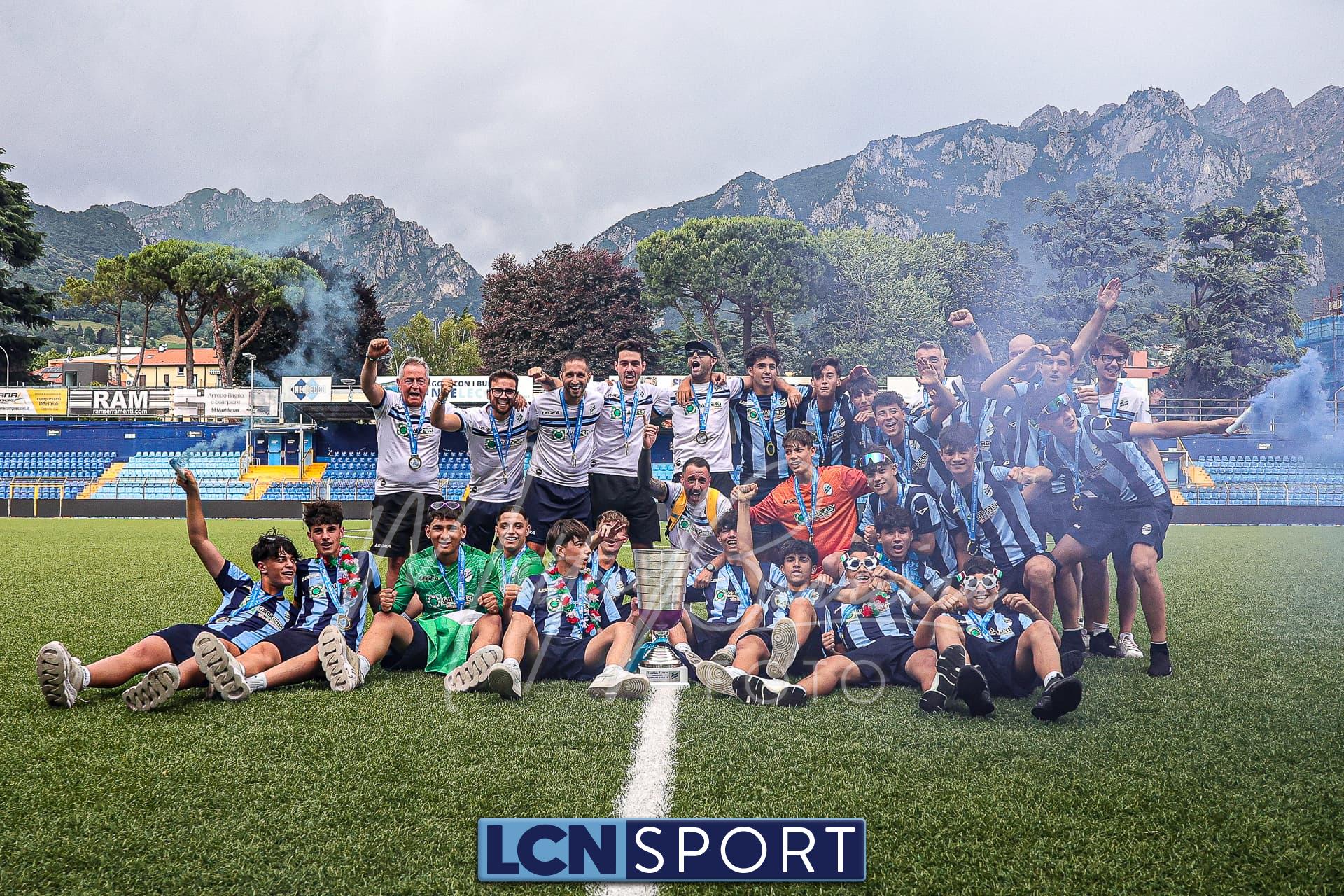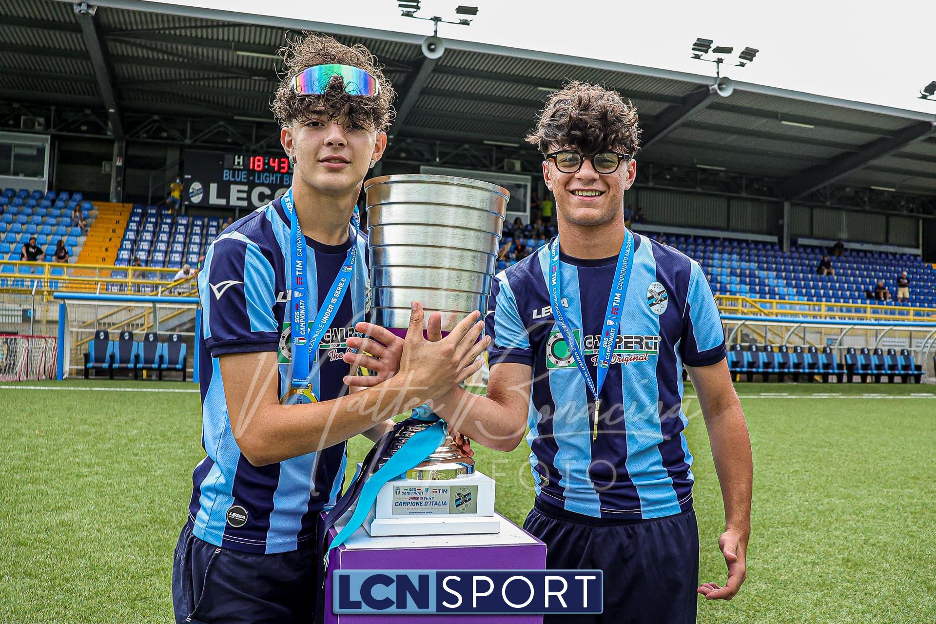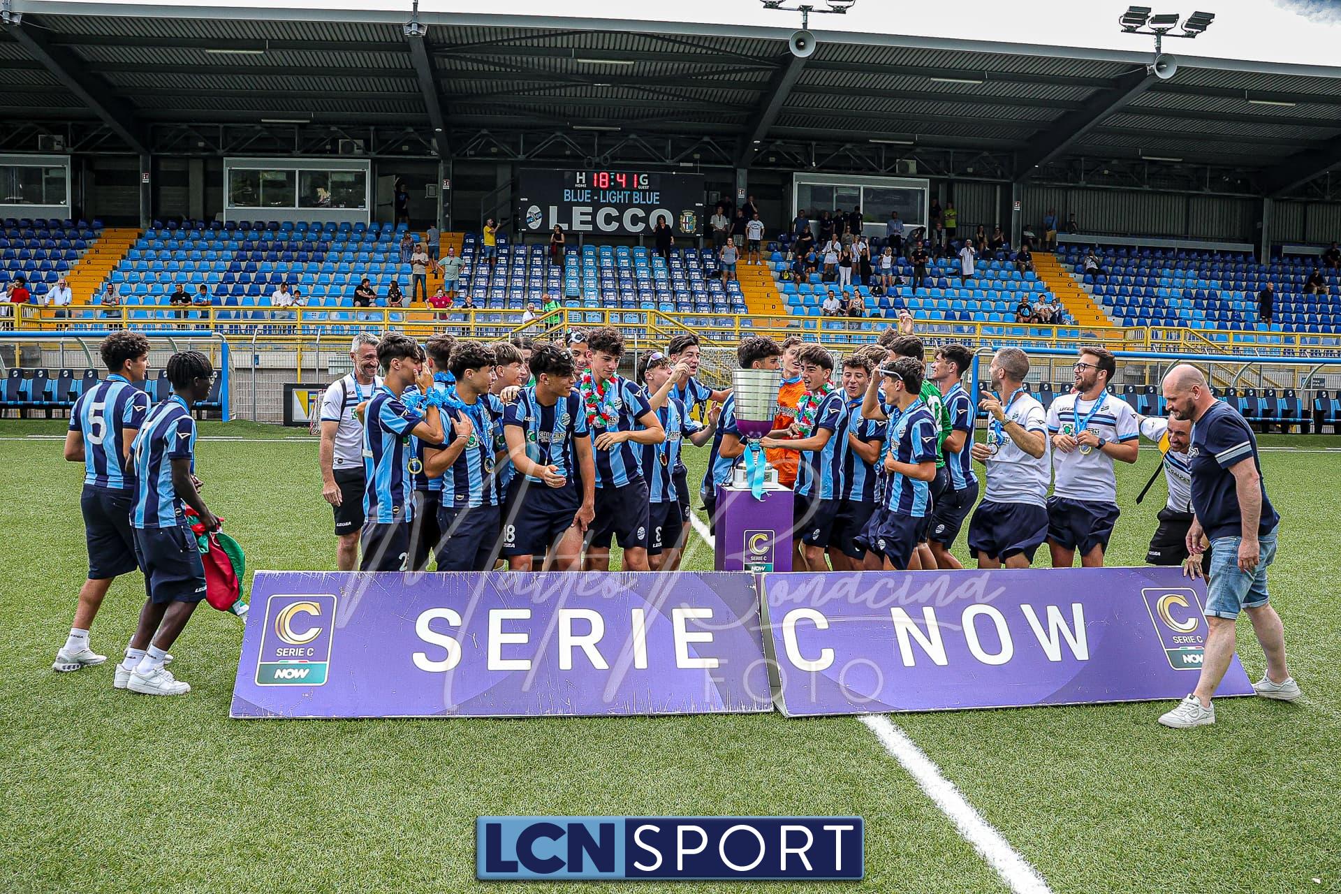 Ultimo atto per la splendida Under 15 della Calcio Lecco 1912. Intorno alle 18, con la tradizionale “strombazzata” celebrativa dell’autista Domenico La Rocca, la delegazione bluceleste ha fatto rientro al “Rigamonti-Ceppi” con lo Scudetto tra le mani del segretario Marco Bolis. Il coloratissimo gruppo guidato da mister Alessandro Vicinanza Toscano si è quindi spostato negli spogliatoi per poi fare il proprio ingresso sul terreno di gioco alla spicciolata annunciati dallo speaker Maurizio Barbuto: a chiudere la sfilata capitan Giacomo Fellini, che ha alzato il trofeo alto nel cielo di Lecco. Non sono mancati canti, balli e i doverosi ringraziamenti per tutti coloro che hanno dato il proprio contributo alla realizzazione di un’impresa straordinaria – dal presidente Aliberti in giù -, frutto del lavoro profuso nel corso di «168 sedute d’allenamento, 35 gare ufficiali, con 28 vittorie e 139 gol segnati, 4 di media a partita». Al termine della cerimonia il gruppone si è spostato allo Shamrock Irish Pub di via Parini per la prosecuzione dei festeggiamenti: ultimo atto per una stagione meravigliosa.