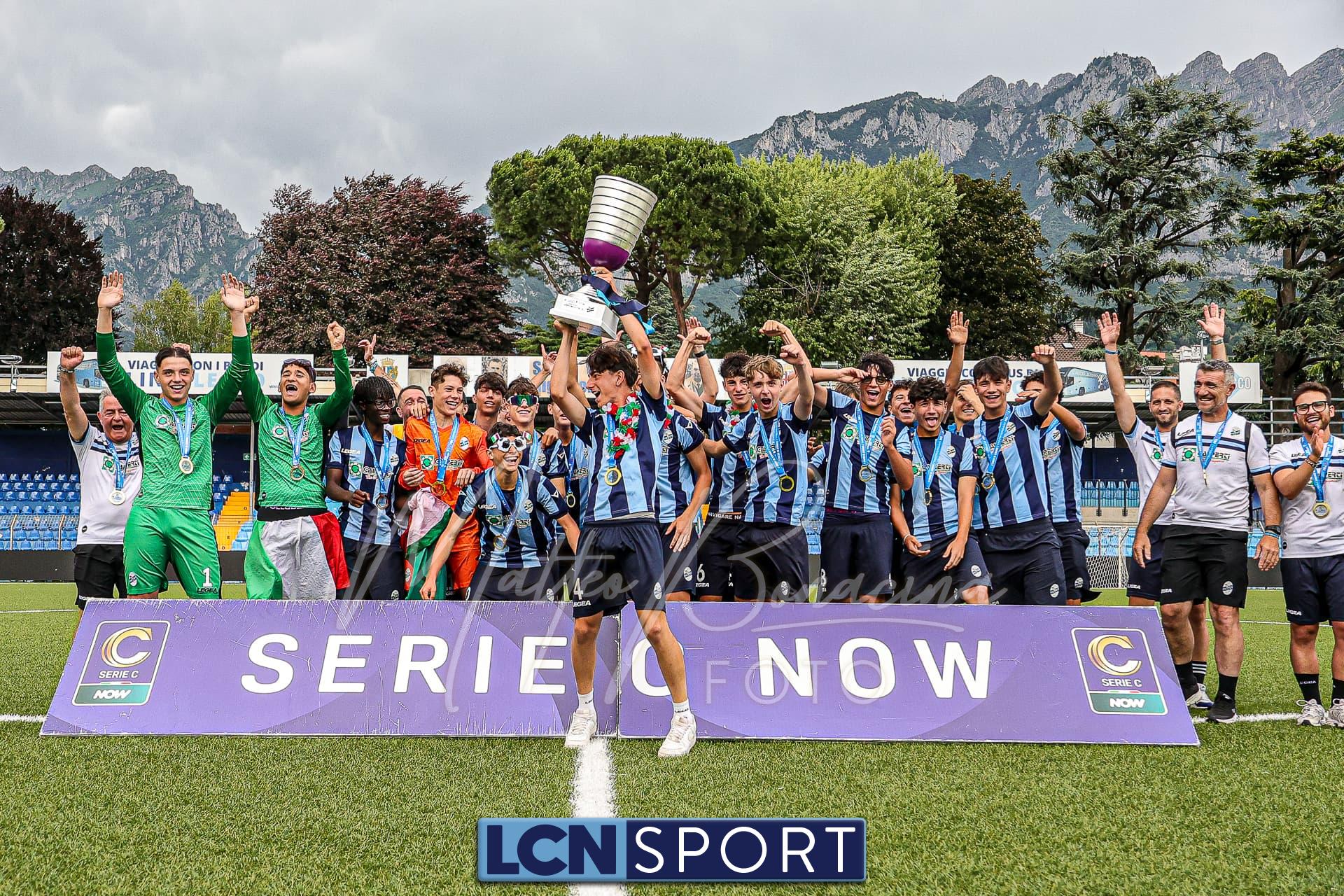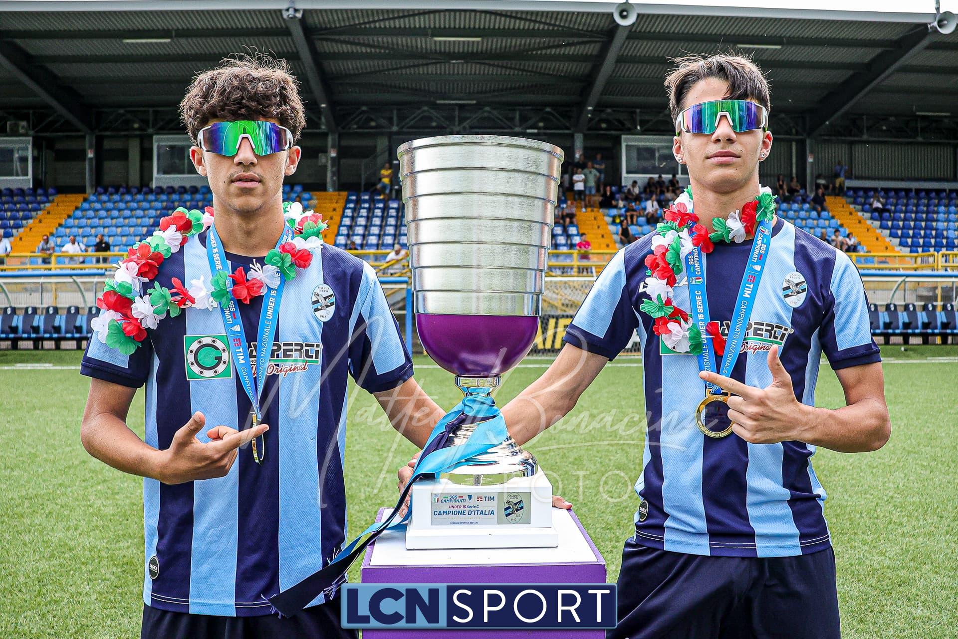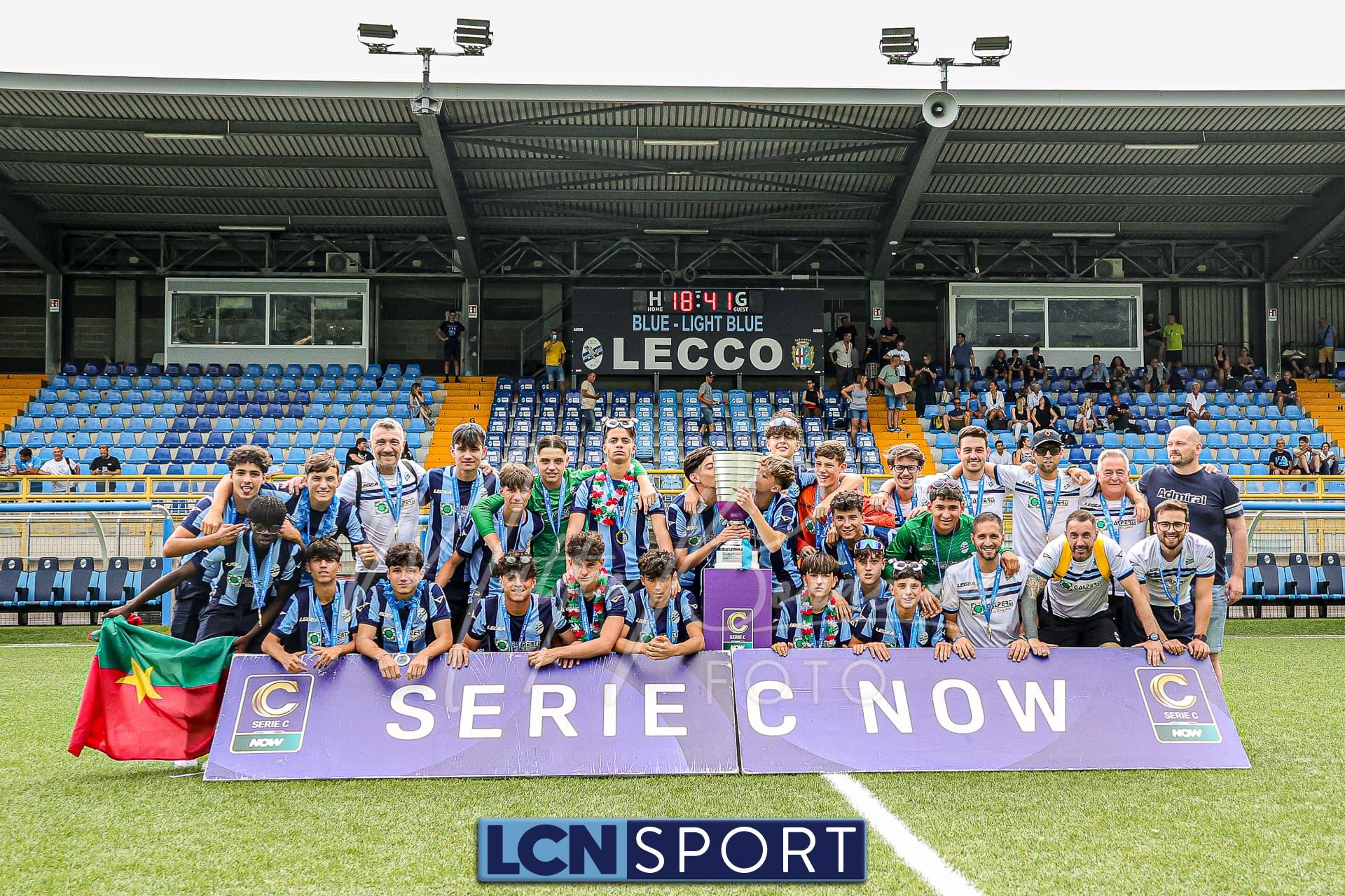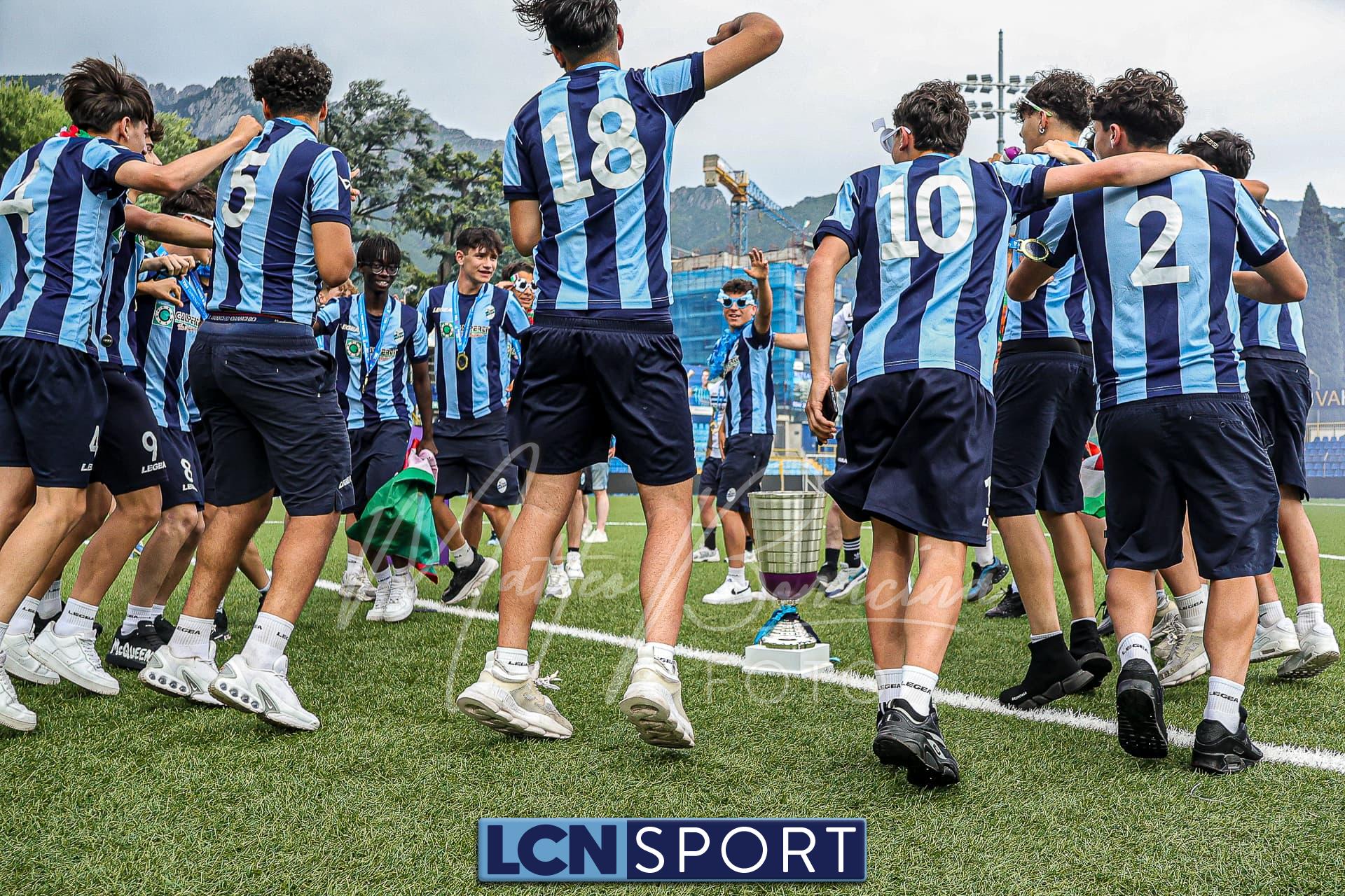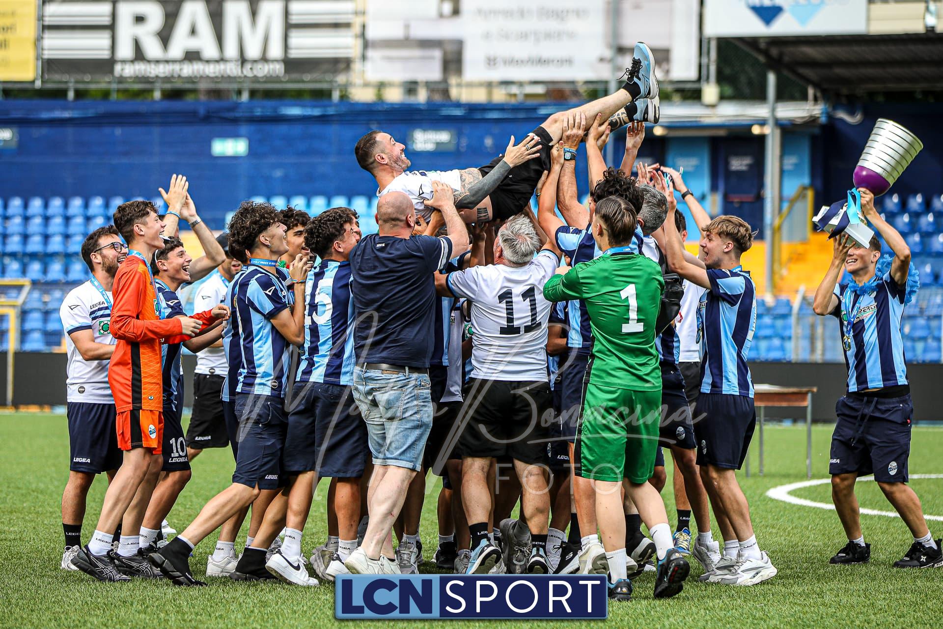 Ultimo atto per la splendida Under 15 della Calcio Lecco 1912. Intorno alle 18, con la tradizionale “strombazzata” celebrativa dell’autista Domenico La Rocca, la delegazione bluceleste ha fatto rientro al “Rigamonti-Ceppi” con lo Scudetto tra le mani del segretario Marco Bolis. Il coloratissimo gruppo guidato da mister Alessandro Vicinanza Toscano si è quindi spostato negli spogliatoi per poi fare il proprio ingresso sul terreno di gioco alla spicciolata annunciati dallo speaker Maurizio Barbuto: a chiudere la sfilata capitan Giacomo Fellini, che ha alzato il trofeo alto nel cielo di Lecco. Non sono mancati canti, balli e i doverosi ringraziamenti per tutti coloro che hanno dato il proprio contributo alla realizzazione di un’impresa straordinaria – dal presidente Aliberti in giù -, frutto del lavoro profuso nel corso di «168 sedute d’allenamento, 35 gare ufficiali, con 28 vittorie e 139 gol segnati, 4 di media a partita». Al termine della cerimonia il gruppone si è spostato allo Shamrock Irish Pub di via Parini per la prosecuzione dei festeggiamenti: ultimo atto per una stagione meravigliosa.
