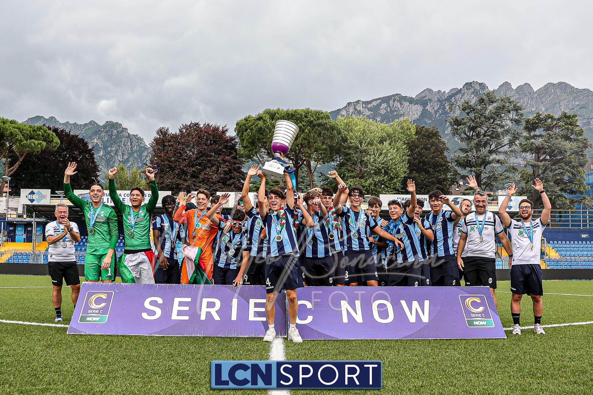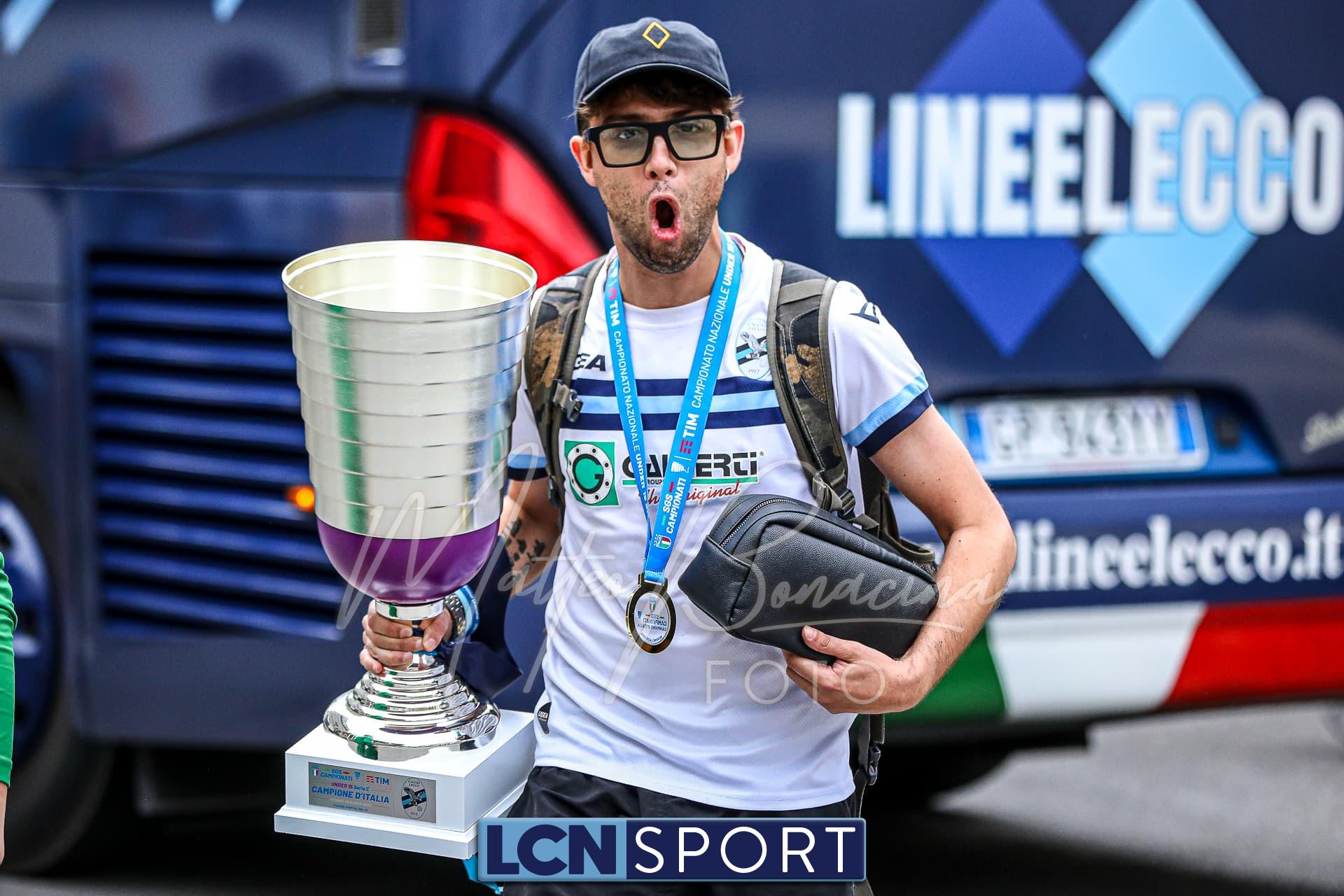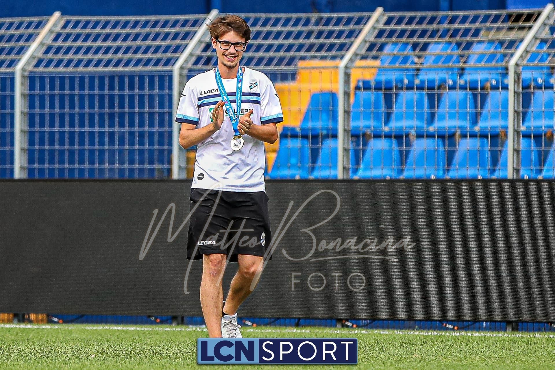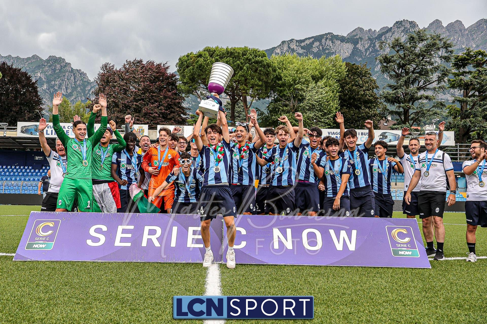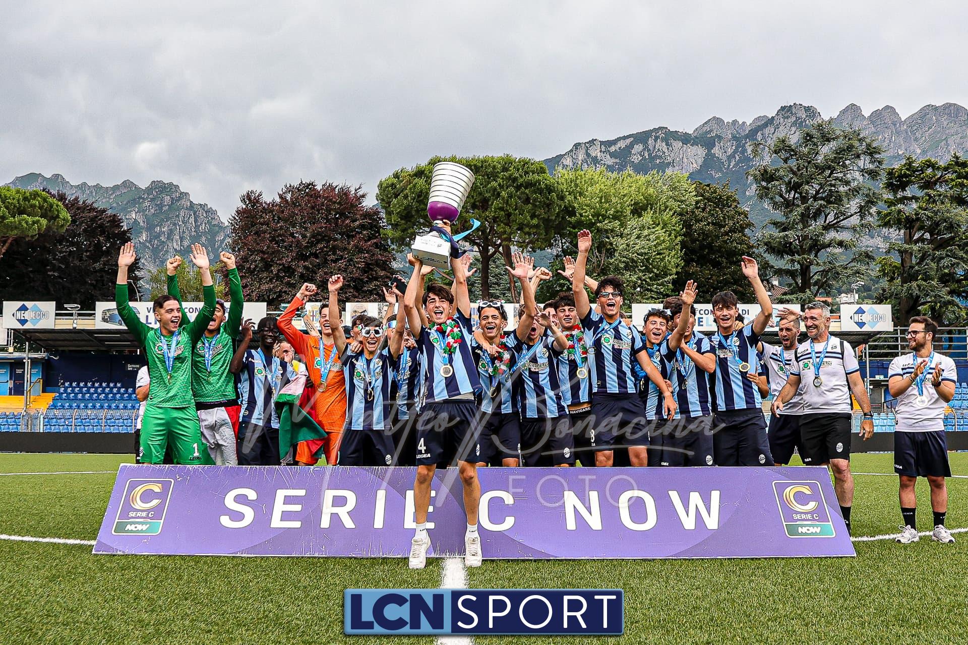 Ultimo atto per la splendida Under 15 della Calcio Lecco 1912. Intorno alle 18, con la tradizionale “strombazzata” celebrativa dell’autista Domenico La Rocca, la delegazione bluceleste ha fatto rientro al “Rigamonti-Ceppi” con lo Scudetto tra le mani del segretario Marco Bolis. Il coloratissimo gruppo guidato da mister Alessandro Vicinanza Toscano si è quindi spostato negli spogliatoi per poi fare il proprio ingresso sul terreno di gioco alla spicciolata annunciati dallo speaker Maurizio Barbuto: a chiudere la sfilata capitan Giacomo Fellini, che ha alzato il trofeo alto nel cielo di Lecco. Non sono mancati canti, balli e i doverosi ringraziamenti per tutti coloro che hanno dato il proprio contributo alla realizzazione di un’impresa straordinaria – dal presidente Aliberti in giù -, frutto del lavoro profuso nel corso di «168 sedute d’allenamento, 35 gare ufficiali, con 28 vittorie e 139 gol segnati, 4 di media a partita». Al termine della cerimonia il gruppone si è spostato allo Shamrock Irish Pub di via Parini per la prosecuzione dei festeggiamenti: ultimo atto per una stagione meravigliosa.