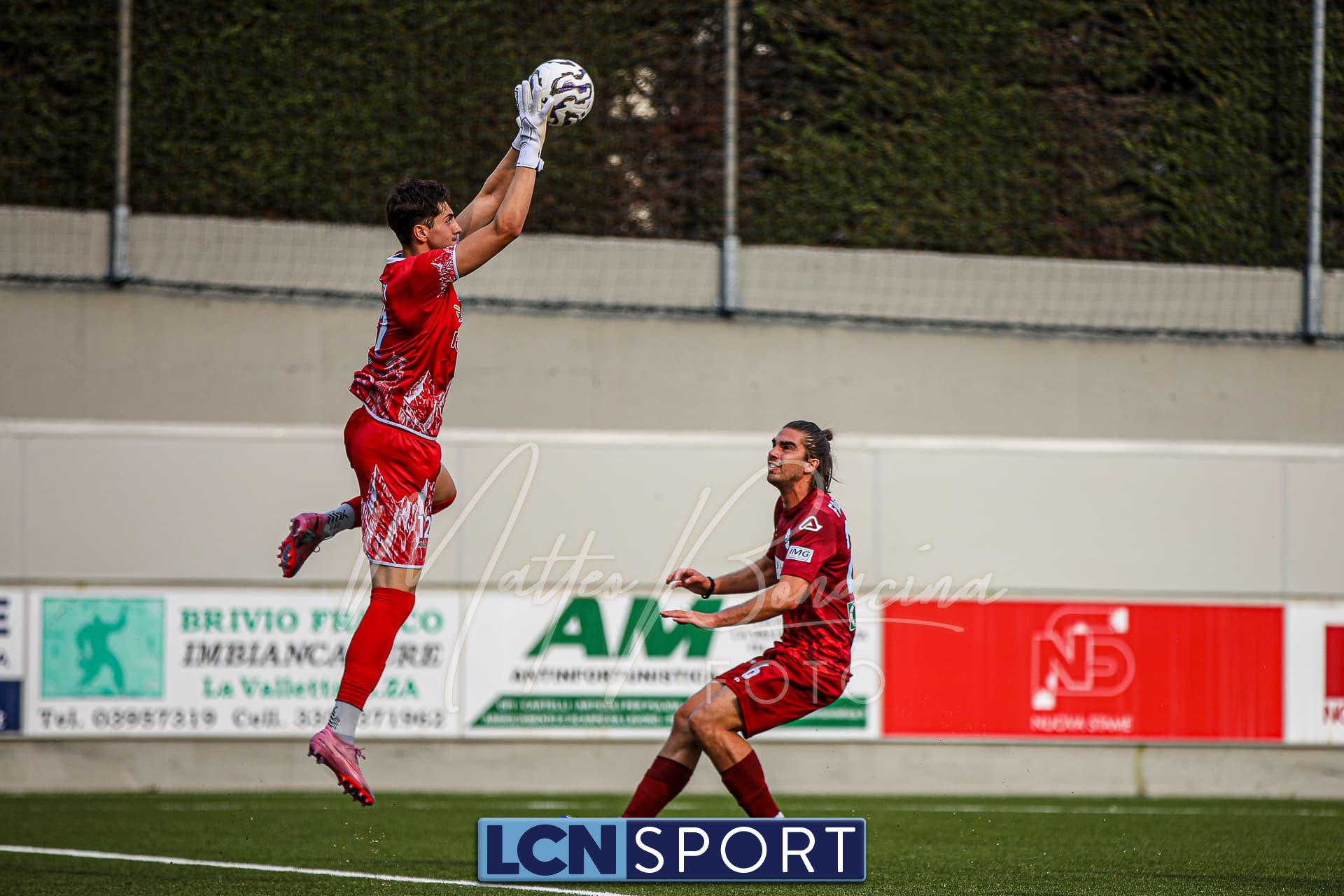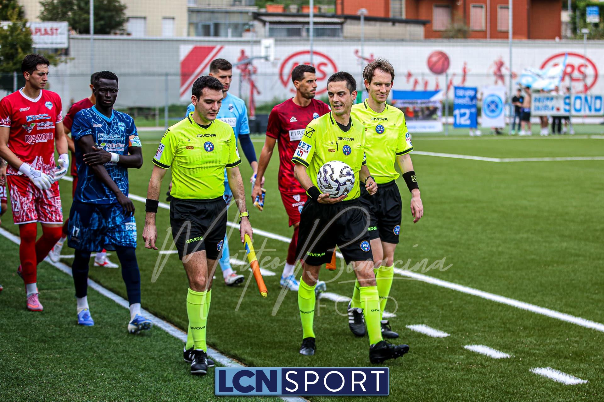 L’avvio di gara ha subito mostrato le buone intenzioni di entrambe le formazioni. Al 2′ Pellegrino si è accentrato dalla sinistra scaricando un tiro potente che ha sfiorato il palo della porta difesa da Uccelletti. Il Lecco ha continuato a spingere e all’11’ si è reso pericoloso con Frigerio, che dopo un recupero palla sulla trequarti ha servito un assist perfetto a Sipos: l’attaccante bluceleste ha però sprecato l’occasione con un primo controllo impreciso. Al 14′ è stato Furrer a non concretizzare una buona opportunità: isolato da uno schema su palla inattiva, il trequartista ha calciato fuori da posizione favorevole. Il Sondrio ha risposto al 25′ con Kremenovic, che di testa ha sfiorato il gol su una punizione laterale ben battuta da Marras. Al 27′ altra occasione per i blucelesti con Sipos che, servito da un cross mancino di Battistini, è stato murato da Uccelletti è stato provvidenziale in uscita. Al 43′ Frigerio ha tentato la conclusione con il destro dalla trequarti, ma il tiro in diagonale si è perso a lato della porta. Il vantaggio è arrivato proprio allo scadere del primo tempo: su calcio d’angolo di Metlika, dopo una serie di rimpalli in area, Zanellato ha fatto da sponda per Sipos che da posizione ravvicinata ha insaccato con facilità. L’attaccante bluceleste ha poi rivolto un eloquente gesto di silenzio verso i tifosi avversari che lo avevano provocato in precedenza.