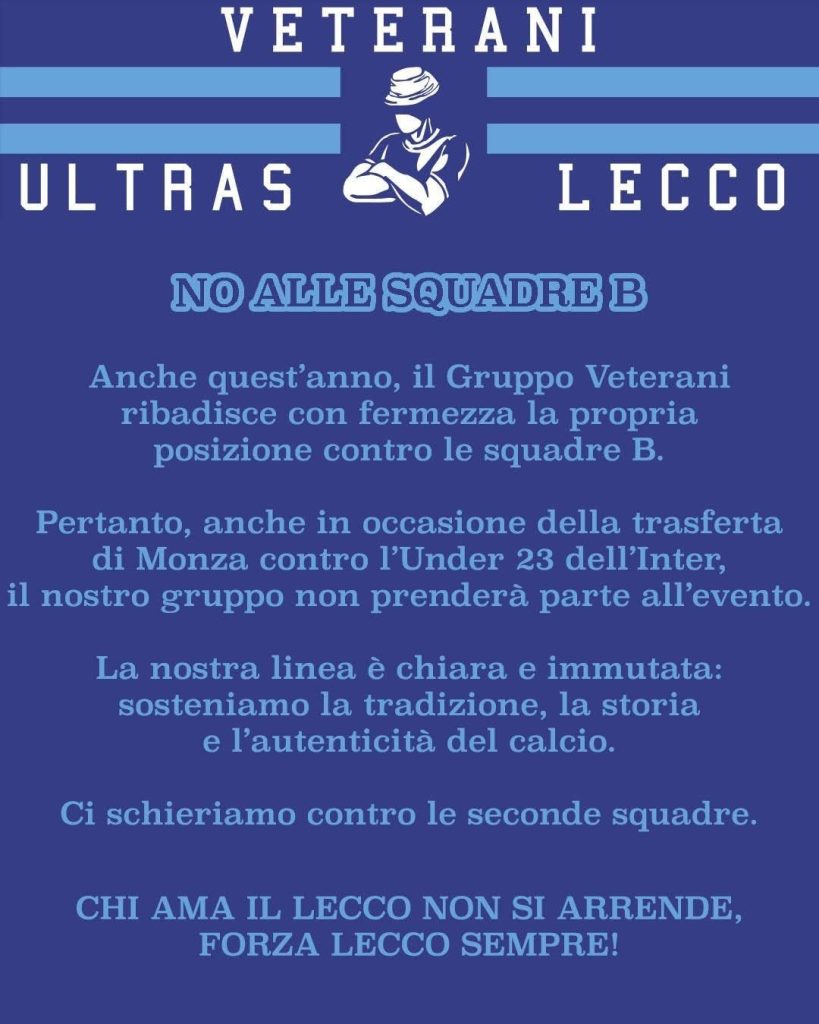 I Veterani Lecco non ci saranno contro l’Inter U23. Il gruppo organizzato della Curva Nord ha ufficializzato tramite striscioni e comunicati social la decisione di non seguire la squadra nella trasferta di domenica 14 settembre all’U-Power Stadium di Monza. Una scelta che conferma la linea di protesta già adottata negli anni precedenti contro le seconde squadre di Serie A presenti in Serie C. “No alle squadre B” è il messaggio apparso su uno striscione affisso sulla recinzione del Parco Belgiojoso, di fronte allo stadio “Rigamonti-Ceppi”. Il gruppo ha ribadito la propria posizione attraverso un volantino diffuso sui social network, sottolineando come “il calcio non è un giocattolo per le big” e manifestando fermezza contro quello che considerano uno snaturamento del campionato di Serie C. La protesta dei Veterani non è una novità: già nelle scorse stagioni il gruppo aveva disertato le trasferte contro Juventus Next Gen e Atalanta U23, mantenendo una linea coerente con i propri principi. Nel comunicato si legge: “Sosteniamo la tradizione, la storia e l’autenticità del calcio. Ci schieriamo contro le seconde squadre”. Nonostante l’assenza dei Veterani, la trasferta di Monza vedrà comunque la presenza degli altri gruppi organizzati della Curva Nord bluceleste, compresi i Cani?Sciolti che saranno presenti in Curva Sud.