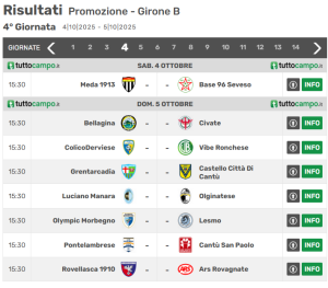 Nel girone B di Promozione lombarda, il Rovagnate è capolista con 9 punti: dopo aver battuto Pontelambrese e Luciano Manara, gli uomini di mister Ziliotto hanno vinto 2-0 all’Idealità contro il neoretrocesso Meda grazie ai gol di capitan Mercuri al 64′ e di Fumagalli al 88′. Segue l’Olginatese con 7 punti alla pari con il Morbegno: i bianconeri, nello specifico, hanno sconfitto di misura al Redaelli la Pontelambrese con il sigillo di Astuti al 14′. La Base 96 Seveso ha realizzato il bottino pieno tra le mura amiche contro la Manara con il punteggio di 2-1: per i bersaglieri ha segnato Arienti nella seconda frazione di gara. Attualmente i biancazzurri sono a quota 3 punti in classifica, mentre la ColicoDerviese ha strappato un punto sul campo del Cantù San Paolo (1-1). La rete dei lecchesi è stata realizzata da bomber Farina al 25′ del secondo tempo. Al momento la banda Altarelli ha 2 punti in campionato. Di seguito, vengono mostrate le gare del prossimo turno: