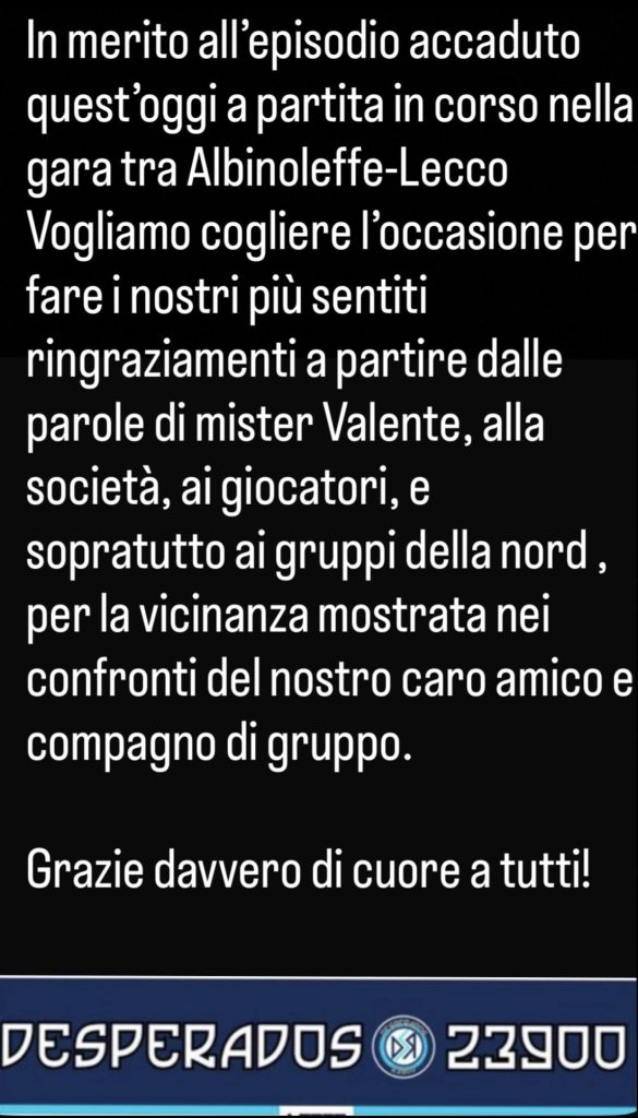 AGGIORNAMENTO 13/10, 10.25 – Il tifoso sta bene. È stato dimesso dall’ospedale dopo aver trascorso la notte in osservazione al Papa Giovanni XXIII di Bergamo. Nessuna grave conseguenza dopo l’impatto avvenuto all’AlbinoLeffe Stadium. Il gruppo Desperados Lecco ha diffuso un breve comunicato per ringraziare della vicinanza dimostrata da mister Valente e dagli altri gruppi della Nord.