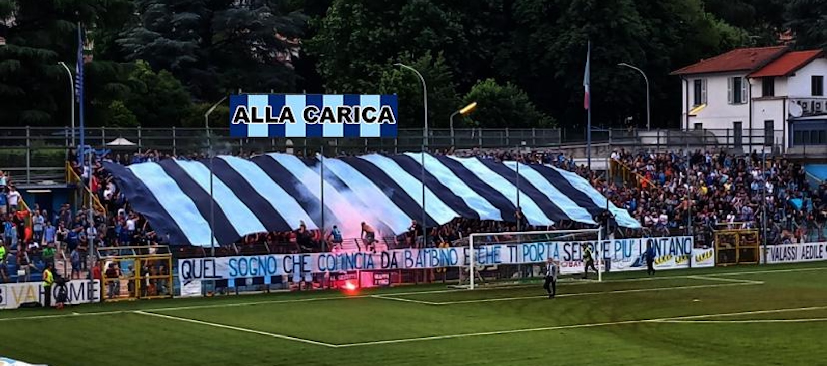 La serata di Lecco-Union Brescia è tornata a far vivere l’atmosfera delle grandi occasioni al “Rigamonti-Ceppi”. In casa bluceleste si sono assiepati ben 4.378 spettatori, 804 dei quali in Curva Sud, per uno splendido spettacolo di cori, colori e anche sfottò tra due tifoserie che da anni coltivano la loro rivalità sugli spalti. A completamento di questa cornice di rara bellezza avrebbe dovuto esserci una scenografia che la Curva Nord di Lecco stava preparando da qualche giorno: nella zona centrale avrebbe dovuto essere steso quel bandierone copricurva già visto in varie altre occasioni da Lecco-LR Vicenza del gennaio 2023 – serata del debutto – in poi, mentre nella zona che sovrasta il settore (lì dov’è presente lo striscione di uno sponsor) avrebbe dovuto essere affisso uno striscione recante la scritta “ALLA CARICA” con il richiamo delle bande verticali blu e celesti, come mostrato nella foto a corredo di questo articolo.