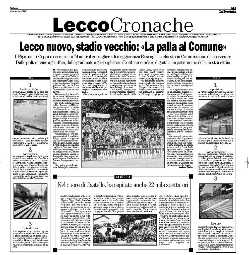 Riqualificazione del Rigamonti Ceppi e sicurezza al Bione. Era il 2006 e sono stati i miei primi atti presentati in una commissione al mio esordio in aula. Dopo un decimo posto l’anno precedente, la Calcio Lecco si apprestava ad affrontare una eroica stagione che ci avrebbe portato in C1 dopo la doppia finale con il PergoCrema, nel classico contesto di tripudio di pubblico ma in un contesto davvero inadeguato, sui leggendari gradoni di granito che avevano sostenuto e sostituito i tubi innocenti di epoca romantica. La gloriosa galoppata finale avrebbe poi convinto il Comune a sostenere un progetto di importante riqualificazione degli spalti, creando un contesto non molto diverso da quello che si è visto fino alla B.