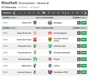 La decima giornata del girone B di Promozione lombarda ha prodotto i seguenti esiti: l’Olginatese cala il poker esterno nella ripresa contro il Castello Città di Cantù e mantiene la vetta della classifica con 24 punti alla pari con il Lesmo. I bianconeri, dopo aver subito gol nel primo tempo, sono andati a segno con Acquistapace al 55′, Catta al 60′ e la doppietta di Astuti, che ha timbrato il cartellino al 75′ e al 84′. Dunque, la formazione di mister Conca rimane ancora imbattuta in campionato. A tre punti di distacco dalla vetta ed in zona playoff, si colloca il Rovagnate secondo, che ha sconfitto in trasferta la Bellagina ritrovando il sapore del bottino pieno in una gara pirotecnica finita 2-3 con tutte le reti nei primi 45′. Nello specifico, Longoni al 20′ porta in vantaggio i biancorossi, ma, un minuto dopo, Lozza pareggia i conti dagli 11 metri. Al 24′ l’ARS raddoppia con Palvarini e fa il terzo gol con R.Sala al 41′. Lozza realizza la doppietta personale a fine primo tempo. Nell’anticipo del sabato, la Luciano Manara ha conquistato un segno X in casa del Meda (2-2): Pozzoli ha sbloccato il match al 21′ per i padroni di casa, mentre nel secondo tempo e, in particolare, al 51′ ha segnato Arienti per i biancazzurri. Brenicci ha gonfiato la rete al 78′ per i brianzoli, ma in extremis Finiguerra ha regalato il pari ai bersaglieri. Al momento i ragazzi di mister Perego, che ottengono il settimo risultato utile consecutivo (4 vittorie e 3 pareggi), sono in fascia playoff e terzi con 18 punti in attesa del recupero del derby Morbegno-ColicoDerviese. Quest’ultimo non si è disputato e rinviato a data da destinarsi per le condizioni del campo casalingo viste le forti precipitazioni che si sono abbattute sulla zona. Infine, il Civate, attualmente a 7 punti in fascia playout, è stato sconfitto per 1-4 dal Cantù San Paolo: il gol iniziale dalla distanza di Franceschini per la Fenice ha preceduto il poker comasco nella ripresa. Di seguito, viene mostrato il programma della prossima giornata: