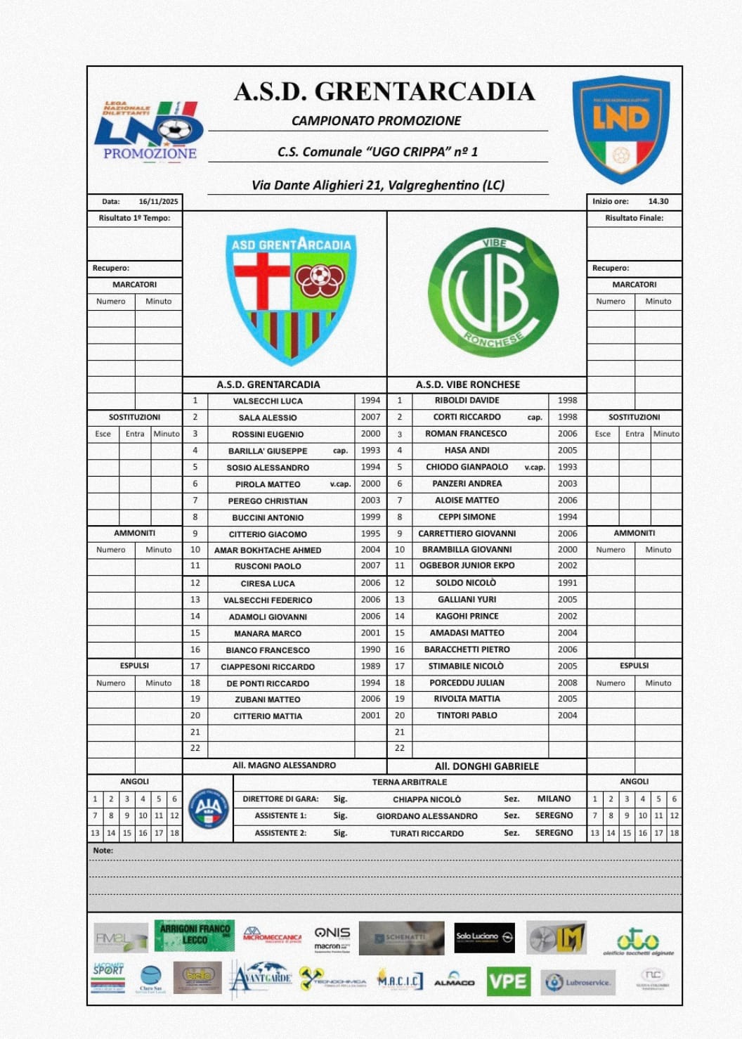 Sotto la pioggia copiosa del Crippa di Valgreghentino si gioca GrentArcadia-Vibe Ronchese, gara valida per la decima giornata del girone B di Promozione lombarda. Al 5′ Buccini prende il palo in area, poi c’è la ribattuta di Citterio parata da Riboldi. Tiro di Bokhtache dalla sinistra sul quale si oppone Riboldi. Si fa sentire anche la Vibe, ma la conclusione dalla destra è fuori misura. Gli ospiti si ritrovano ancora in zona offensiva e, su assist dalla destra, il tentativo termina a lato da pochi passi. La GrentArcadia torna all’arrembaggio: prima la conclusione dalla sinistra dalla distanza, poi il corner che termina in rete, ma l’arbitro ha annullato per fallo in attacco. Altro palo colpito dalla formazione casalinga, ma l’azione viene interrotta per offside. La Vibe ha attaccato nel finale, ma senza impensierire particolarmente Valsecchi. Termina 0-0 il primo tempo.