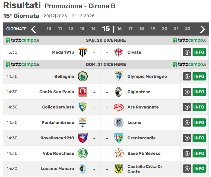 Di seguito, viene mostrato il quadro delle gare dell’ultima giornata del girone d’andata del girone B di Promozione lombarda: