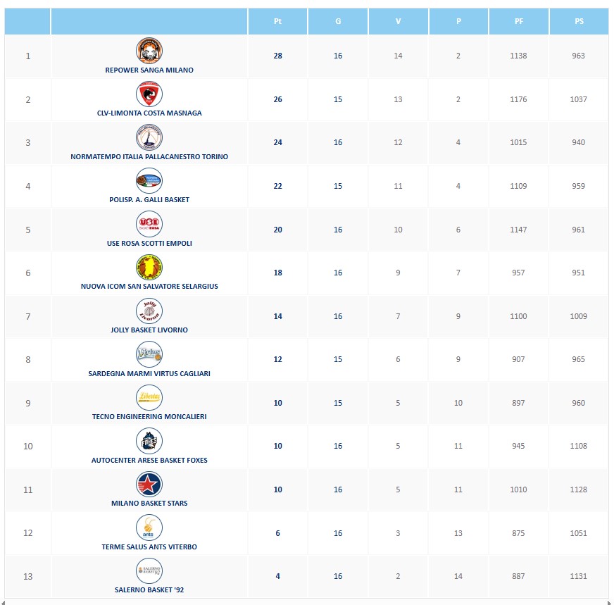 Un successo prezioso per le meneghine, perché consente loro di salire a 28 punti in 16 partite, a +2 sul Costa che però ne ha disputate 15. Virtualmente, le due squadre sono appaiate. Più indietro, un po’ a sorpresa, la Pall. Torino a 24 (16 incontri), quindi San Giovanni Valdarno a 22 (15). Le prime quattro posizioni, a questo punto del campionato, sembrano affare di queste formazioni.