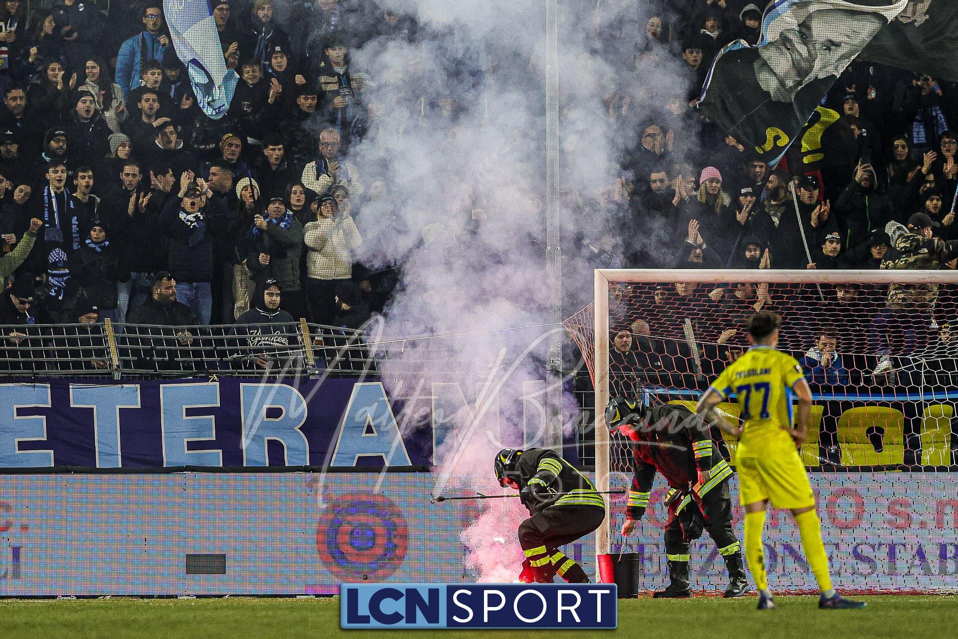 1. all’11° minuto del primo tempo, un fumogeno sul terreno di gioco, all’interno dell’area di rigore della propria squadra così provocando la bruciatura del manto erboso e la sospensione della gara per un minuto circa, per consentire la relativa rimozione da parte dei Vigili del Fuoco;