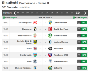 Nel penultimo turno del girone B di Promozione lombarda, la formazione di mister Perego ha rifilato un tris vincente considerando anche i risultati favorevoli dagli altri campi come quello di Colico