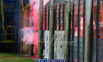 Ai quattro giovani è contestata l'accensione e il lancio in campo delle torce, oltre all'esplosione di un grosso petardo: niente stadio...